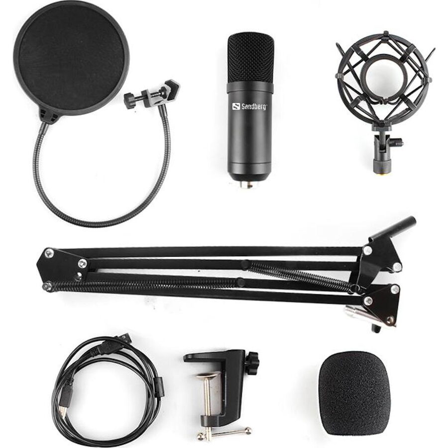 USB mikrofon, stojan, pop-filtr, USB kabel, rychlý průvodce
