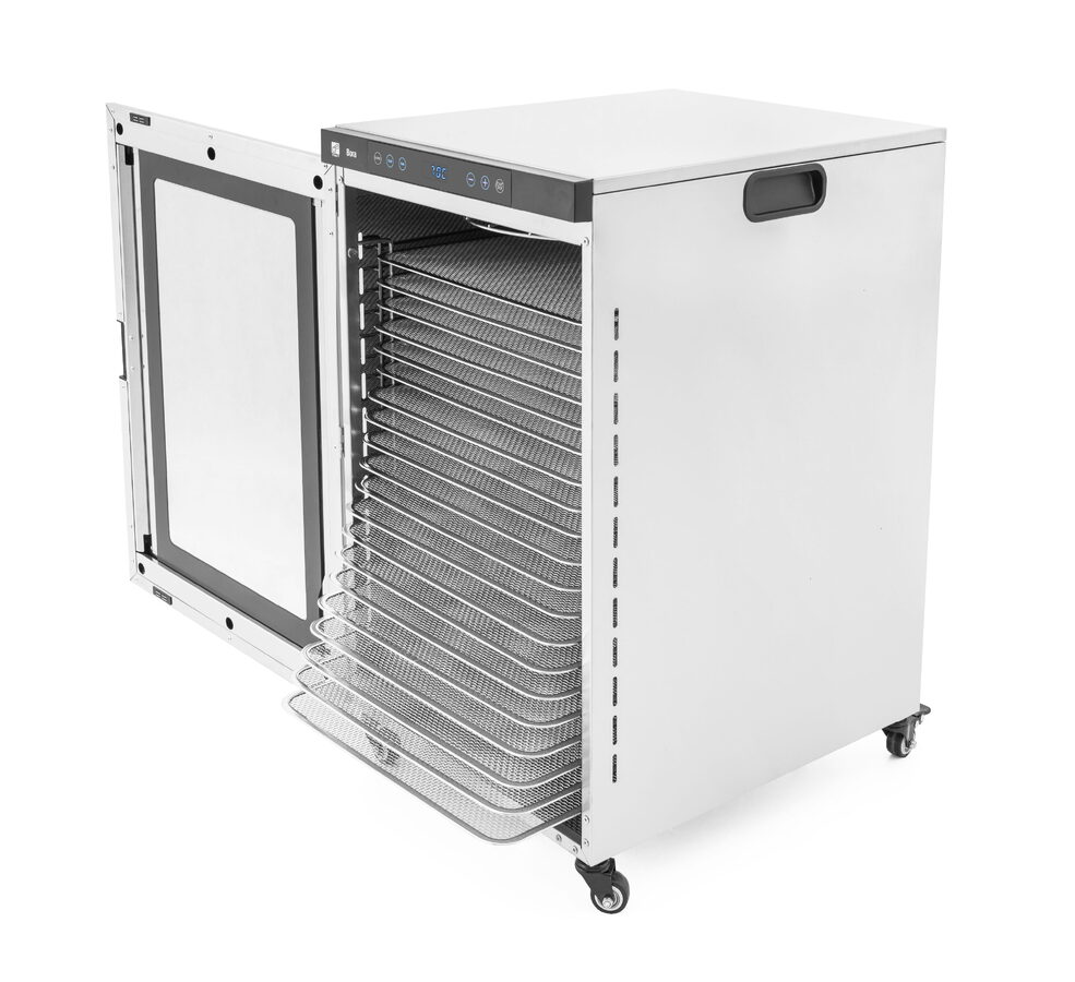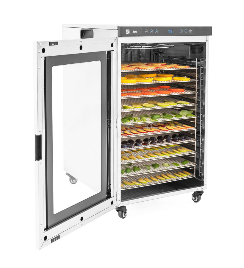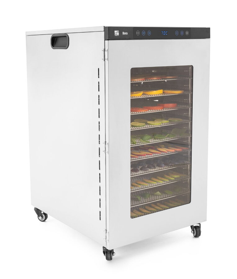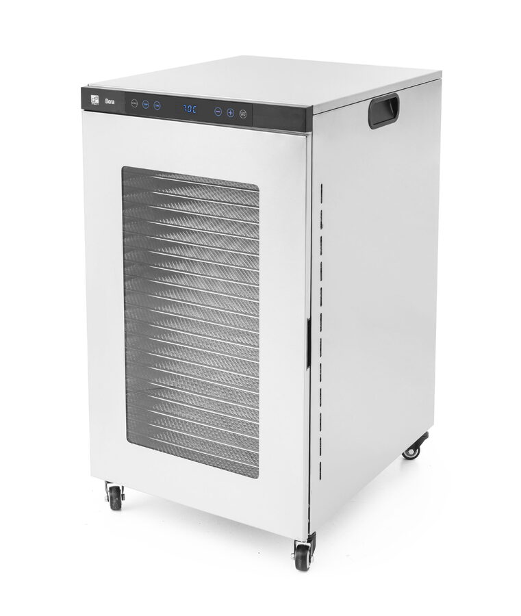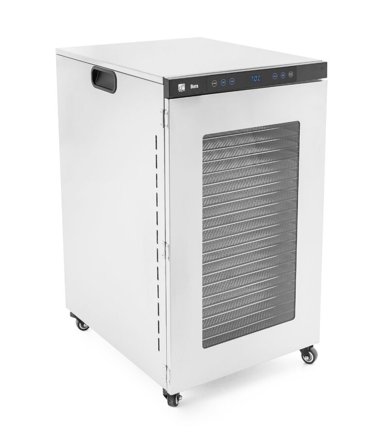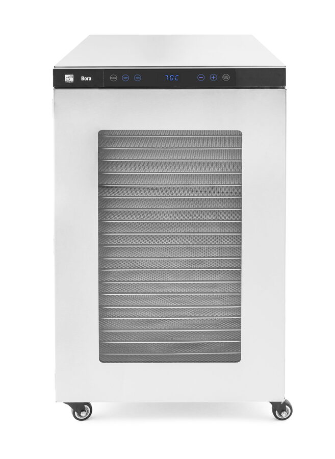 K sušičce Bora jsme přibalili 20 nerezových sušících plat a 20 vložek s jemným síťováním, které vám usnadní sušení drobných surovin. Na digitálním ovládacím panelu nastavíte potřebnou teplotu od 35°C do 75 °C, zvolíte čas sušení (až 48 hodin) a dál se o nic nestaráte. Po ukončení nastaveného programu se přístroj automaticky vypne.