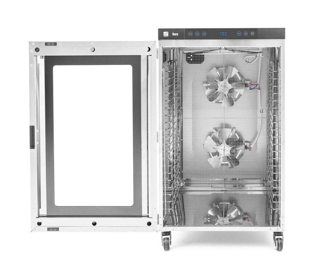 Vyrobili jsme ji převážně z nerezu. Tělo i 20 sušících plat. Nerez je zdravotně nezávadný, snadno se čistí a přitom zvládne i každodenní zátěž v kuchyni nebo provozu. Matný kov v kombinaci se skleněným okénkem působí moderně, čistě a sušičce Bora opravdu sluší.
