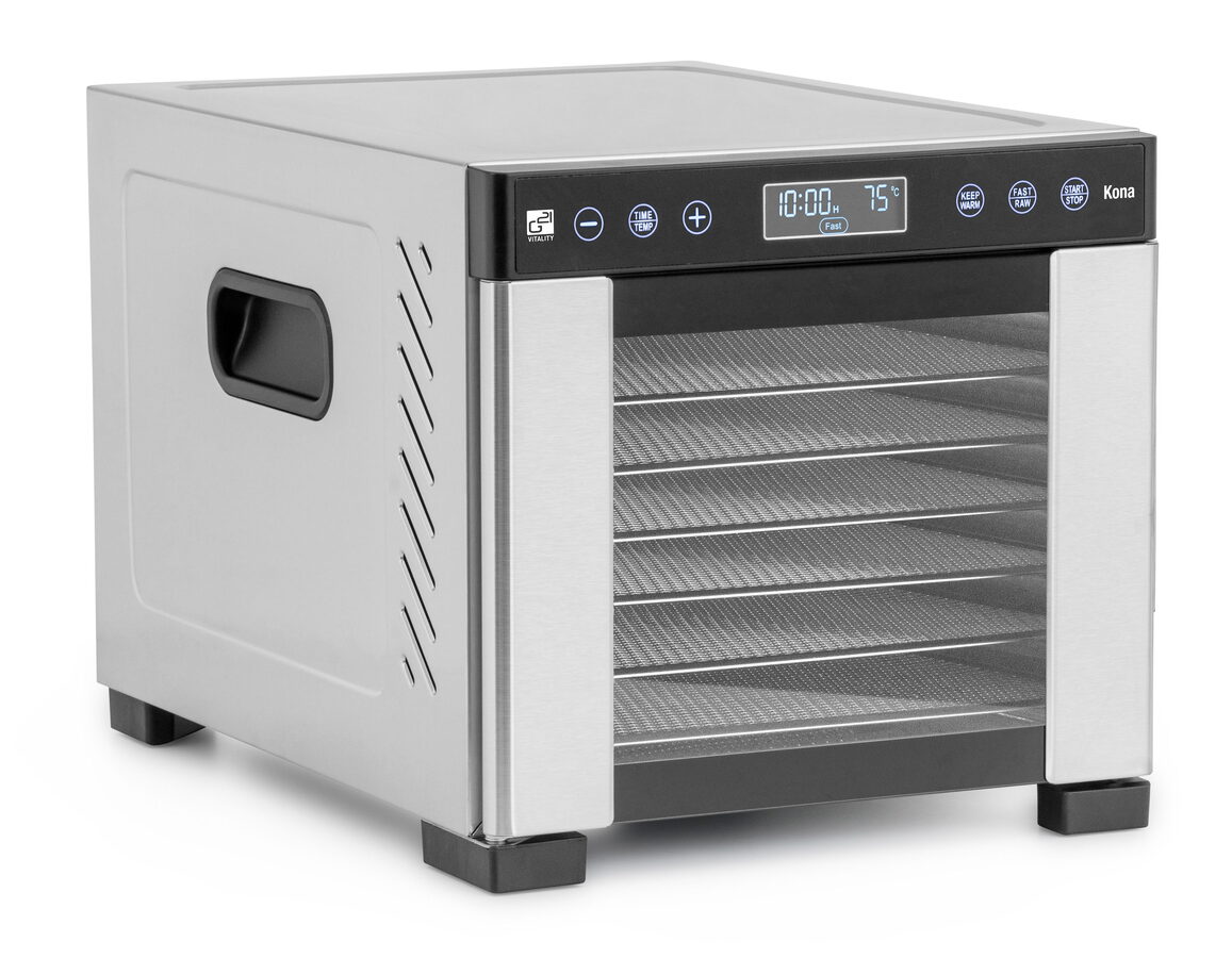 Sucho už má v názvu a svými schopnostmi i výkonem vás tato kompaktní sušička rozhodně překvapí. Pokud jste si při výběru sušičky potravin došli k názoru, že hledáte spíš menší sušičku, zato ale s profesionálními vlastnostmi i provedením, Kona je přesně tou pravou sušičkou ovoce, zeleniny, hub, masa i bylinek pro vás.