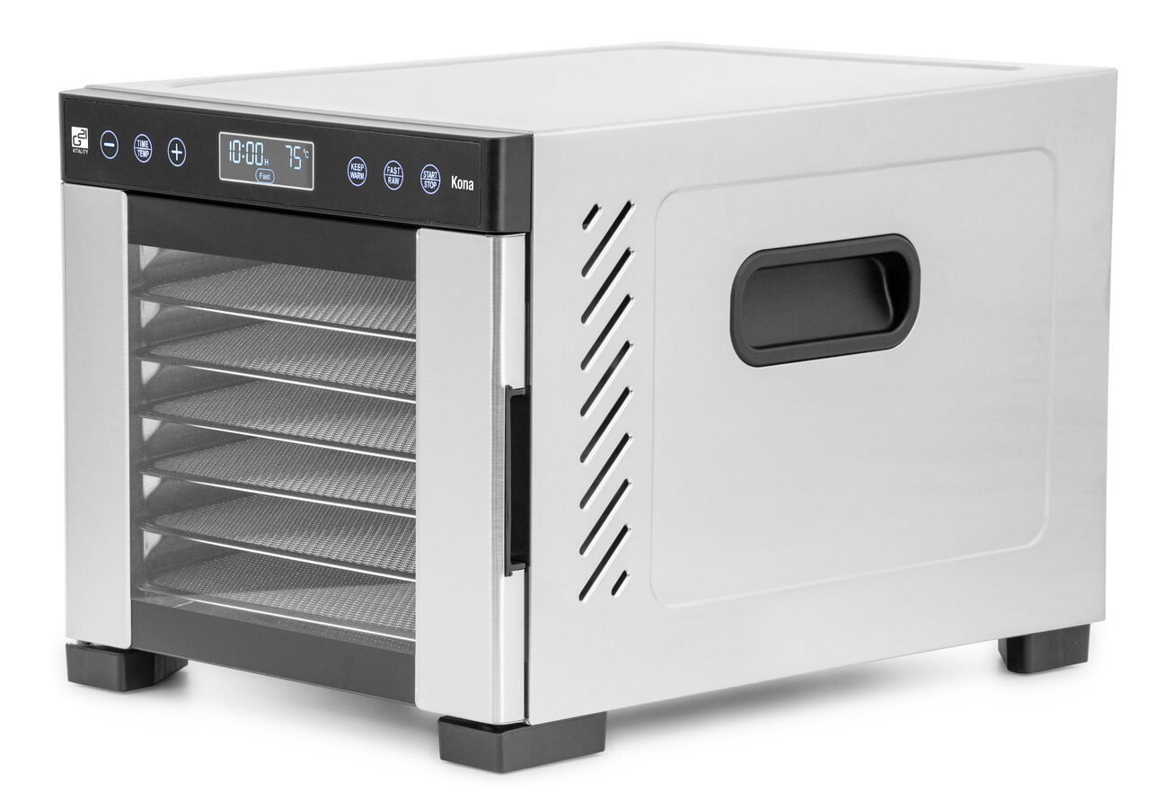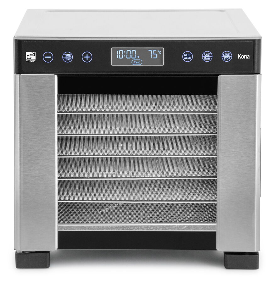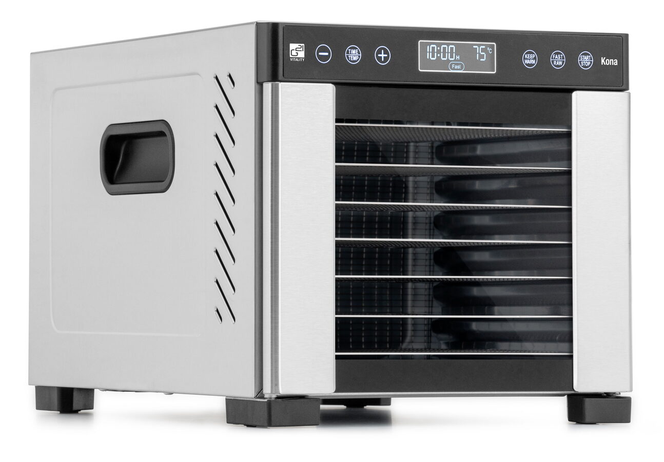 Řídící jednotka sušičky G21 Kona má dokonale řešenou elektroniku, ovládání je intuitivní a snadné. Časovač hlídá dobu přípravy a po skončení sušení sušičku sám vypne. Velkou výhodou je funkce KEEP WARM pro udržení teploty i po skončení sušení. Díky této funkci sušička s minimálním výkonem udrží teplotu 35 °C po dobu 24 hodin. Pak se sama vypne. Regulátor teploty vám dává absolutní kontrolu nad sušicím procesem. Usušte si to, co chcete, přesně tak, jak to chcete.