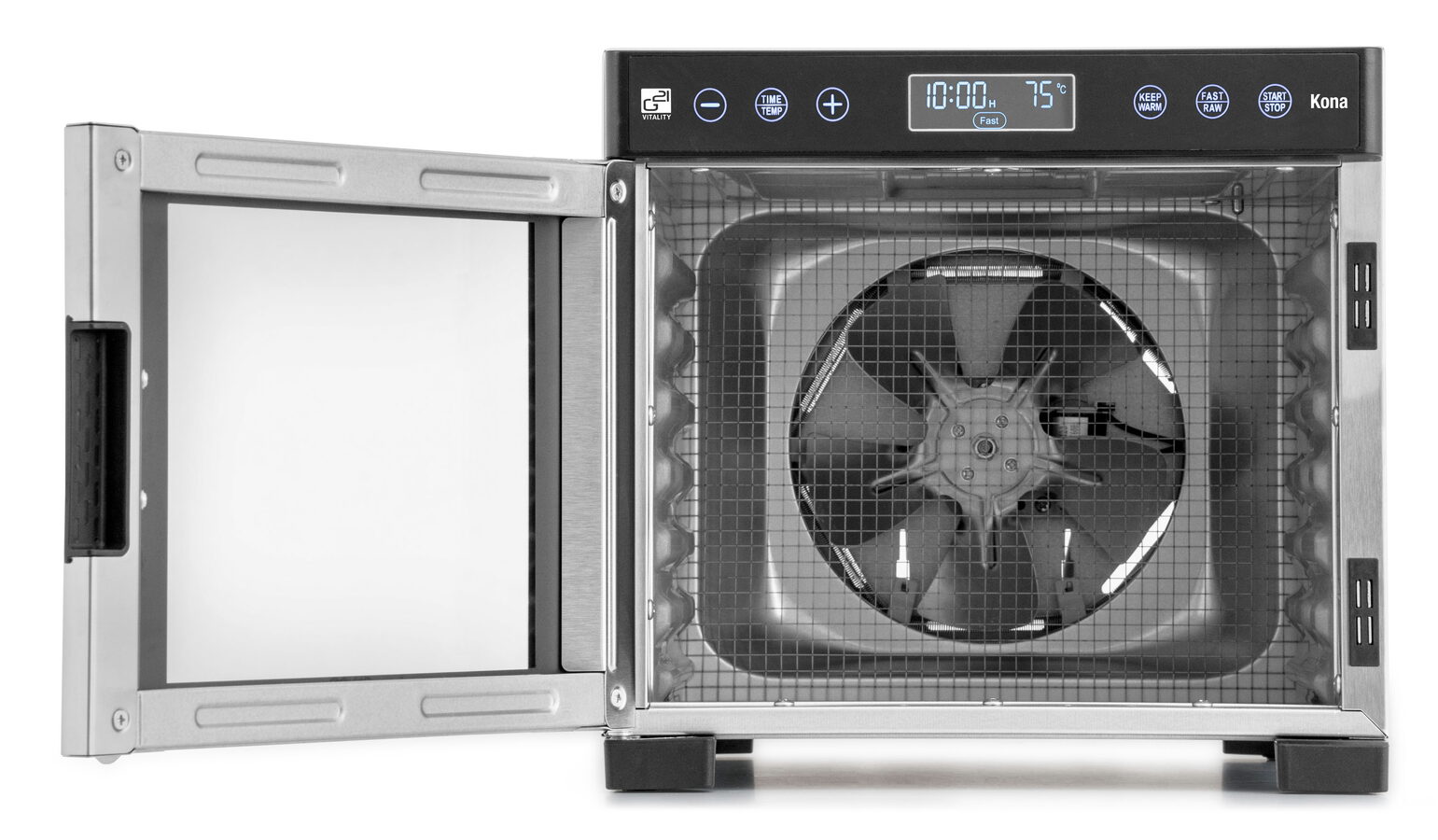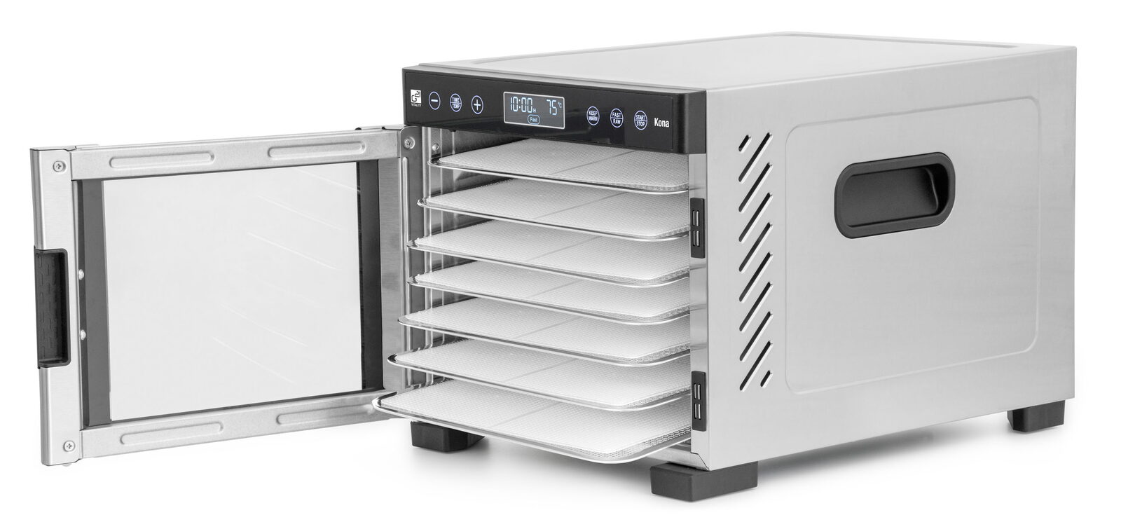 Zatímco u jiných sušiček v této cenové kategorii je ventilátor umístěný na spodní části, takže plata se sušenými surovinami musíte pro lepší usušení přesouvat, Kona je svým provedením o třídu výš. Díky strategicky umístěnému ventilátoru v ní proudí vzduch horizontálně. Dvířka s okénkem na čelní straně navíc zajišťují nižší spotřebu energie, dokonalou cirkulaci vzduchu, efektivnější sušení a zkracují dobu sušení potravin.