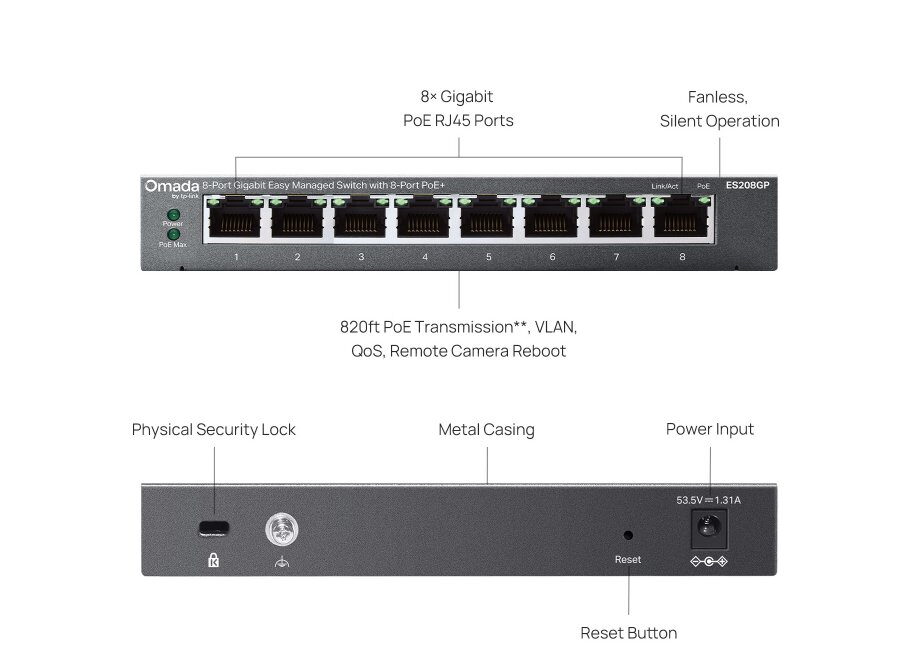 TP-Link ES208GP je snadno spravovatelný 8portový gigabitový switch s podporou PoE+ a celkovým výkonem 64 W. Je ideálním řešením pro napájení IP kamer, přístupových bodů nebo VoIP telefonů, a to díky podpoře Omada SDN a bezplatné cloudové správě Omada Cloud Essentials.
