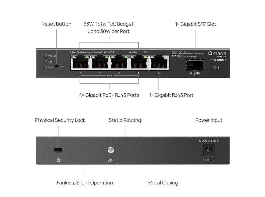 Začněte budovat moderní a výkonnou síť s PoE+ switchem TP-Link SG2206MP, který nabízí 5 gigabitových portů, z toho 4 s PoE+ napájením a jeden SFP slot pro optické připojení. Díky centralizované správě přes platformu Omada SDN jde o ideální volbu pro malé firmy, kanceláře i technicky vyspělé domácnosti.