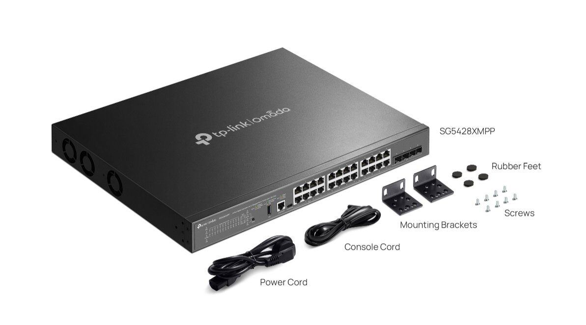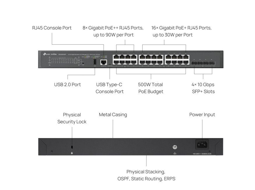 Switch nabízí 24 gigabitových RJ45 portů, z toho 8 portů podporuje PoE++ s výkonem až 90 W a 16 portů PoE+ až 30 W. Díky celkovému PoE rozpočtu 500 W snadno napájí bezdrátové přístupové body, IP kamery nebo VoIP telefony. Funkce Fast PoE a Perpetual PoE zajišťují napájení i během restartu switche.