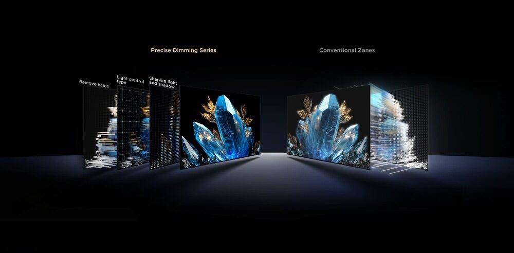 Řada Precise Dimming označuje Mini LED televizory vybavené technologií All-domain Halo Control. Nová generace výkonných světelných čipů, koncentrovaných mikro čoček a technologie Micro-OD umožňuje preciznější tvarování světla v jednotlivých zónách a několikanásobně lepší potlačení halo efektu oproti běžným LED zónám. Ve spojení s HVA panelem s vyšším přirozeným kontrastem a špičkovým algoritmem pro řízení světla a stínu, přináší řada Precise Dimming realistické ztvárnění světla a stínů a výrazně zvyšuje celkovou kvalitu obrazu oproti běžným televizorům – pro skutečně prémiový obrazový zážitek.