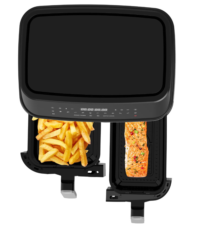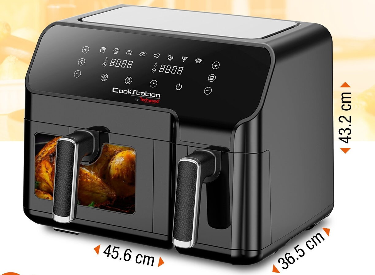 Dvojitá horkovzdušná fritéza Techwood CS927 s kapacitou 9 l (2×4,5 l) a výkonem až 2600 W přináší revoluční způsob zdravého fritování bez oleje. Díky dvěma nezávislým fritovacím zónám o celkovém objemu 9 l je ideální pro větší rodiny nebo hostiny.