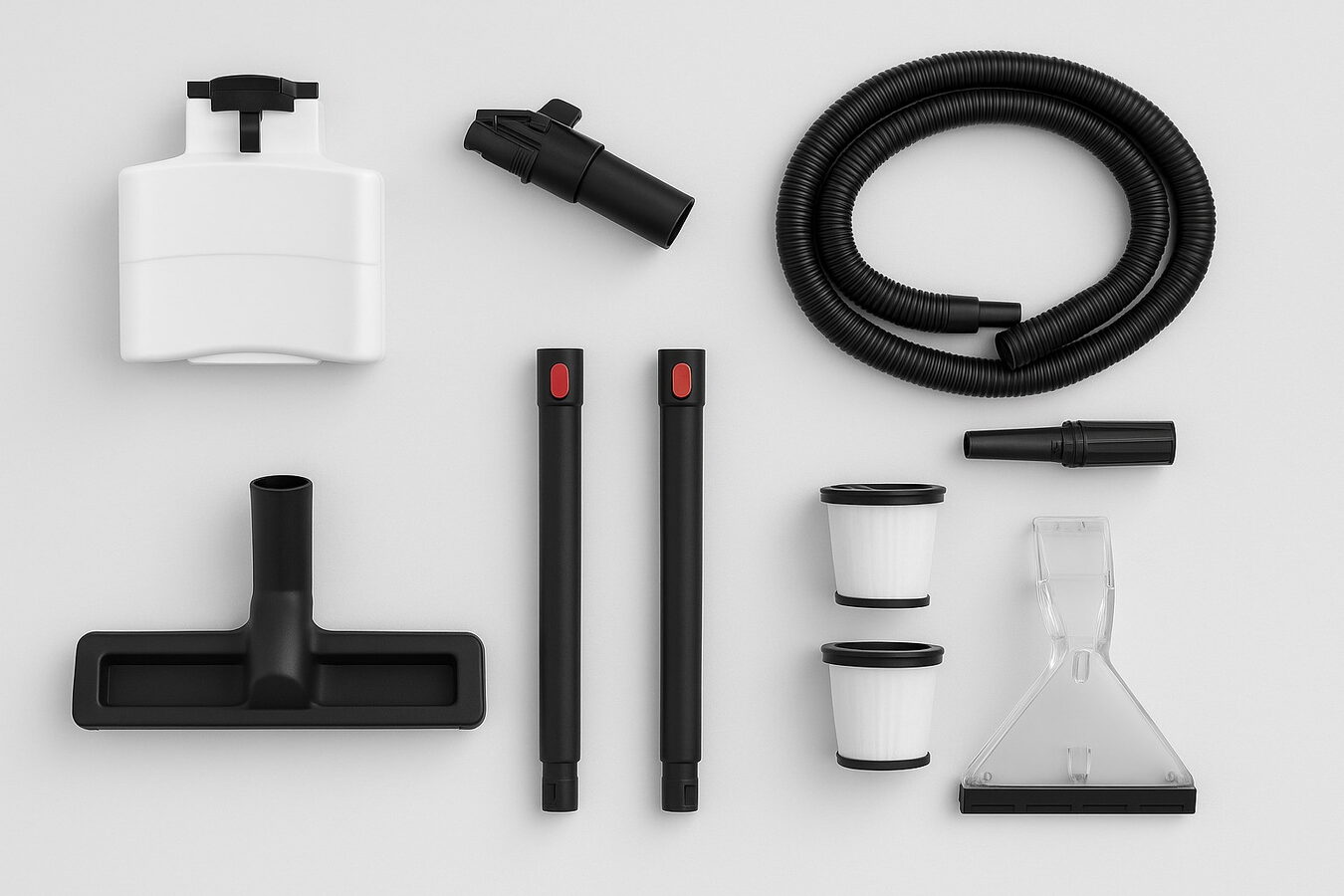 Součástí balení je bohaté příslušenství – dvě 44 cm trubice, flexibilní hadice o délce 1,5 m, kartáče na koberce i čalounění, štěrbinová tryska a nástavec na odsávání vody. Maximální průtok vzduchu přesahuje 28 litrů za sekundu a výkon postřiku dosahuje až 800 ml/min, což umožňuje rychlé a efektivní zvlhčení povrchu před samotným čištěním.