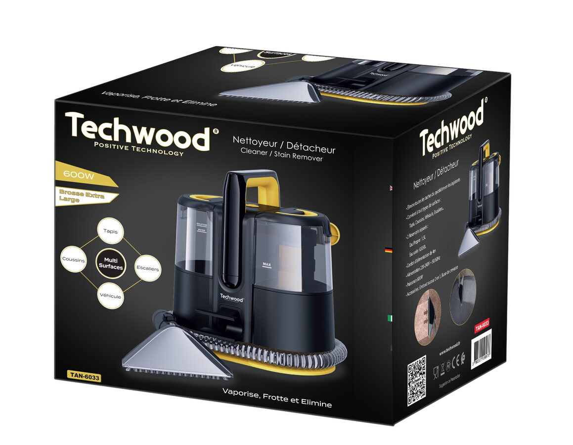 Tepovač, čistič koberců a čalounění Techwood TAN6033 s extra širokým kartáčem a výkonem 600 W je ideální pro efektivní odstranění každodenních nečistot z koberců, sedaček, čalounění, schodišť i interiéru automobilu. Přístroj disponuje dvěma oddělenými nádržkami – na čistou vodu (1,5 l) a na špinavou vodu (0,85 l) – a je vybaven praktickými nástavci, včetně 2v1 hubice a štěrbinové trysky.