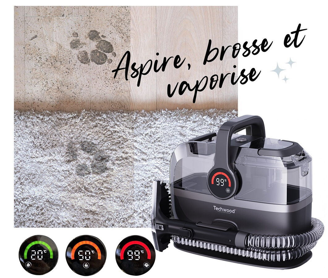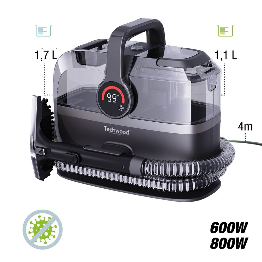 Parní tepovač, čistič koberců a čalounění Techwood TAN7066V kombinuje parní funkci s účinným sáním a nabízí tři režimy čištění s digitálním displejem. Díky dvěma odděleným nádržkám (1,7 l čistá voda, 0,85 l špinavá voda) a vysokému výkonu (600 W sání + 800 W pára) je ideální pro důkladné čištění všech typů povrchů – koberců, čalounění, interiéru vozidel i schodů.
