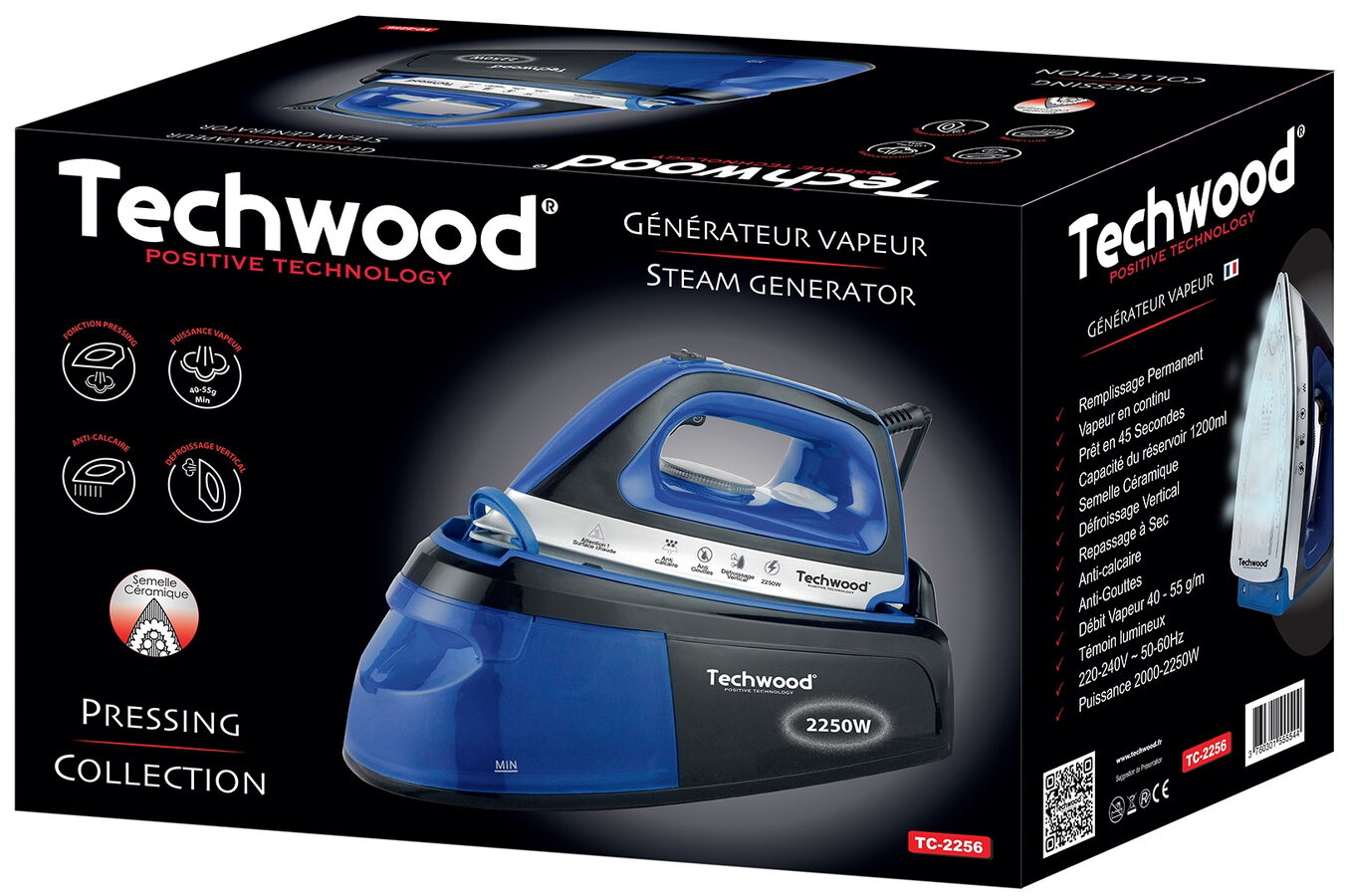 Parní generátor Techwood TC2256 s výkonem 2250 W, který zajistí efektivní žehlení i většího množství prádla. Díky keramické žehlicí ploše, rychlému nahřátí do 45 sekund a stálému parnímu výkonu 40–55 g/min zvládne snadno odstranit i odolné záhyby.