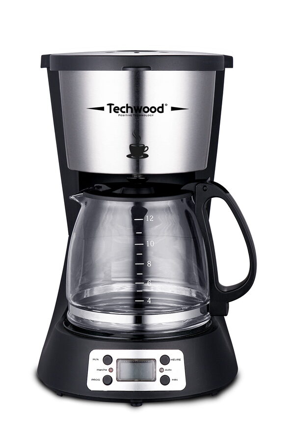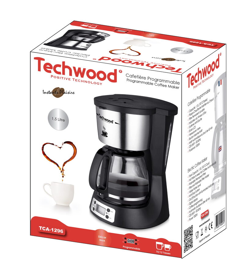 Kávovar Techwood TCA1296 je moderní a programovatelný model s elegantním nerezovým designem a praktickým LCD displejem. Nabízí kapacitu až 1,5 litru, což postačí pro přípravu až 12 šálků kávy – ideální pro rodiny i kanceláře.