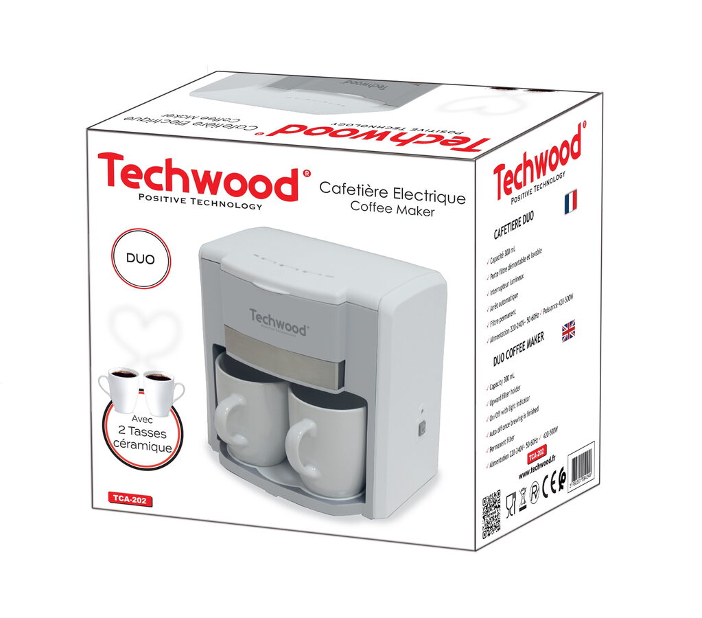 Kávovar Techwood TCA202 je kompaktní přístroj pro přípravu dvou šálků kávy současně. Ideální pro každodenní použití doma i v kanceláři, zajišťuje rychlou a pohodlnou přípravu kávy do dodaných keramických šálků.