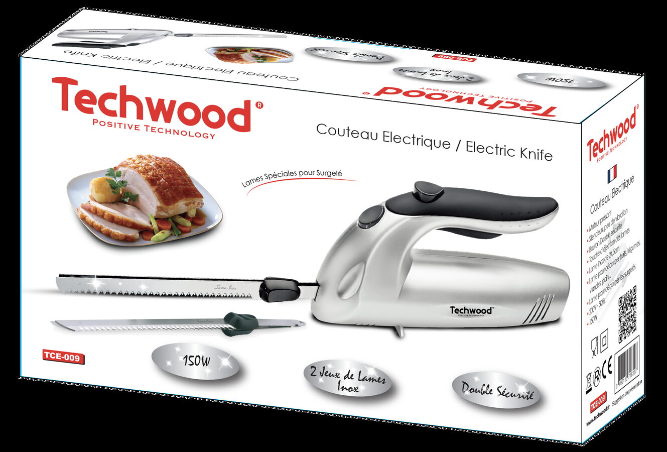 Nůž je vybaven systémem dvojité bezpečnosti a tlačítkem pro snadné uvolnění čepelí, což zvyšuje bezpečnost i komfort při používání. Součástí balení jsou dvě čepele z nerezové oceli o délce 24,5 cm – jedna pro mražené potraviny a druhá pro běžné použití (ovoce, zeleninu, maso, pečivo).