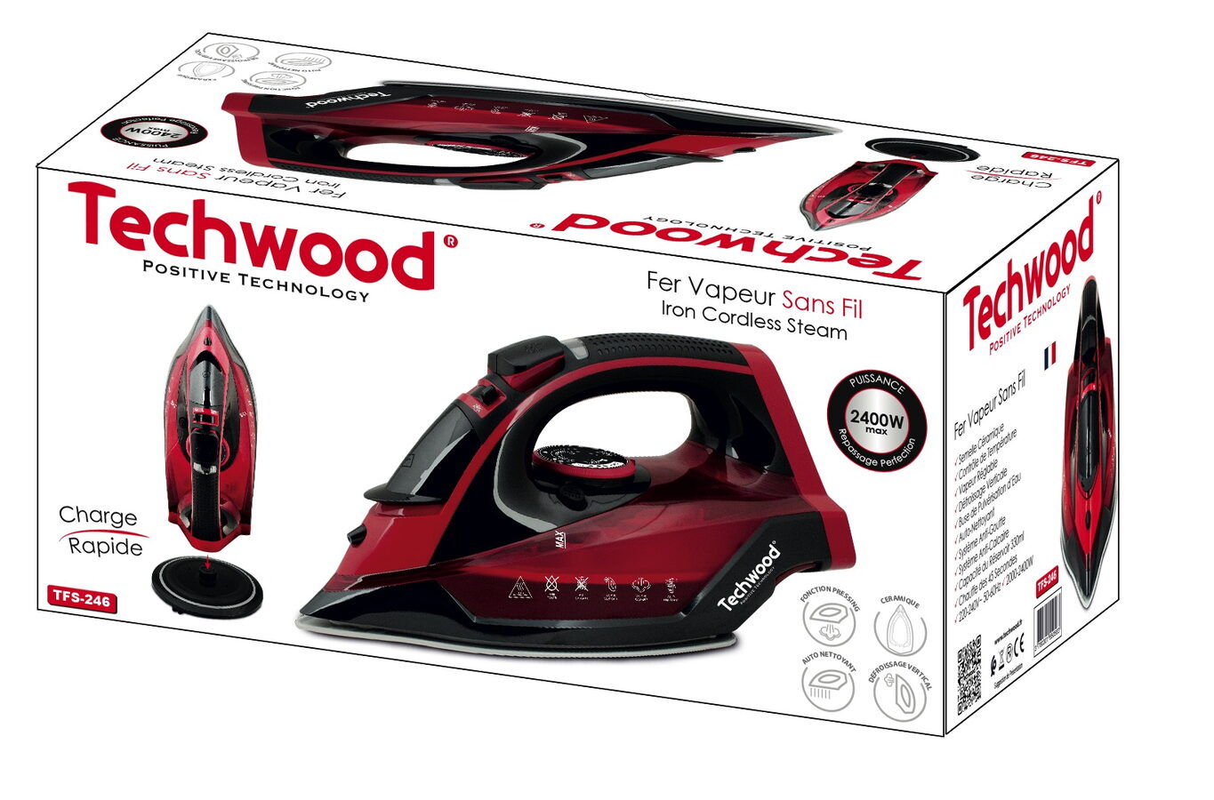 Bezdrátová napařovací žehlička Techwood TFS246 s keramickou žehlicí plochou a vysokým výkonem 2850 W. Díky rychlému nahřátí do 45 sekund a regulovatelnému parnímu výkonu je ideální pro efektivní a pohodlné žehlení všech druhů tkanin.