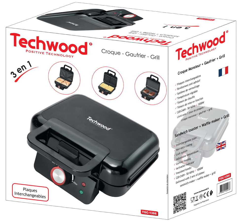Sendvičovač 3v1 Techwood TGC1366, kombinuje funkce toustovače, vaflovače a elektrického grilu. Díky vyměnitelným deskám s nepřilnavým povrchem si jednoduše připravíte sendviče, vafle i grilované dobroty.