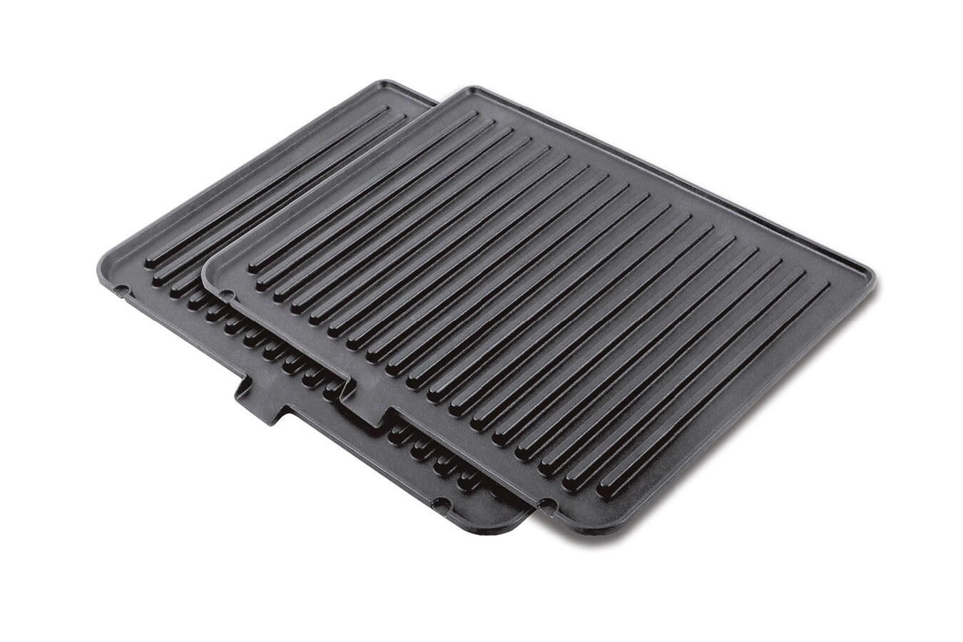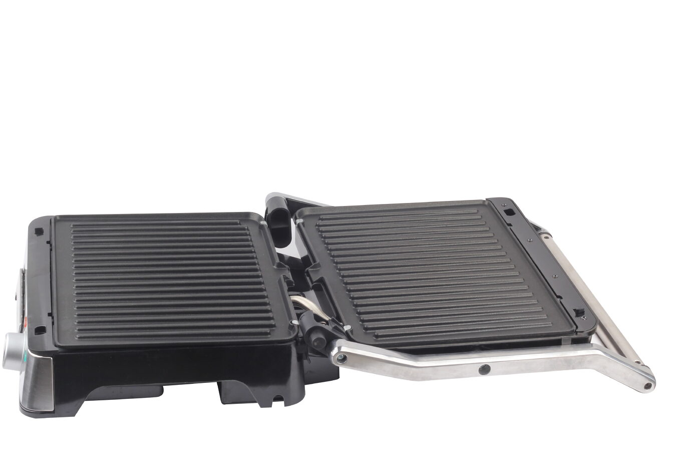 Vysoce kvalitní, velké a odnímatelné nepřilnavé desky, rozměr jedné grilovací plochy je 29 x 24 cm. Horní deska s nezávislým naklápěním se přispůsobí výšce grilovaných potravin. Reliéf roštu. Plně rozeviratelný na 180°