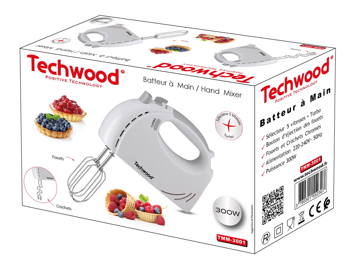 Ruční šlehač Techwood TMM3001 je výkonný model s příkonem 300 W, který nabízí 5 nastavitelných rychlostí a funkci „Turbo“ pro okamžité zvýšení výkonu při náročnějším šlehání či hnětení.