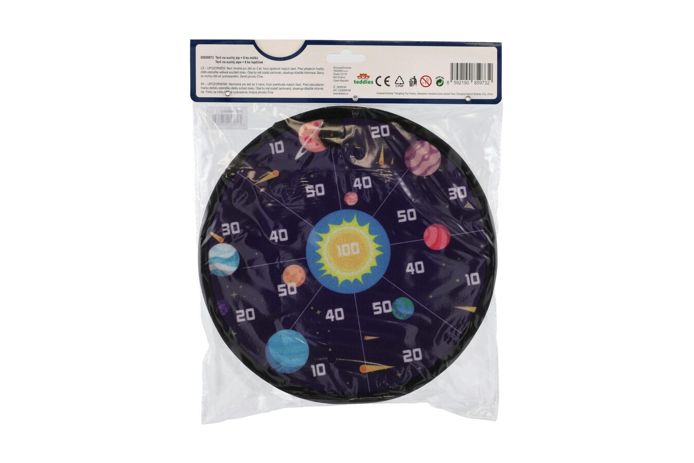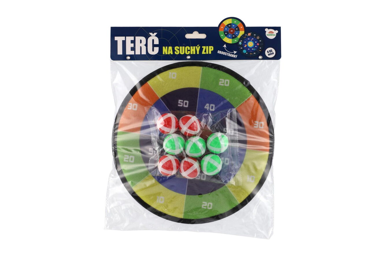 Terč na suchý zip dostane kluky i holky. Je to veselá hra, při které se vaše děti naučí mířit a házet . Nechte vaše děti soupeřit mezi sebou. Cílem hry je hodit co největší čísla. Jejich sčítáním se děti procvičí i v matematice. Terč na suchý zip má dva designy. Jedna strana terče je barevná s čísly, druhá je v motivu vesmíru s čísly. Terč má očko na zavěšení. Balení obsahuje: Terč na suchý zip oboustranný + 8 ks míčků se suchým zipem.