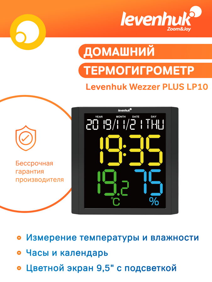 Termohygrometr Levenhuk Wezzer PLUS LP10 bude díky svému stylovému designu a barevné LCD obrazovce skvělým doplňkem pro vaši domácnost nebo kancelář. Tento malý přístroj dokáže měřit teplotu a úroveň vlhkosti vzduchu v místnosti, takže budete mít vždy přehled o klíčových parametrech mikroklimatu. Zobrazuje také čas, datum a den v týdnu.