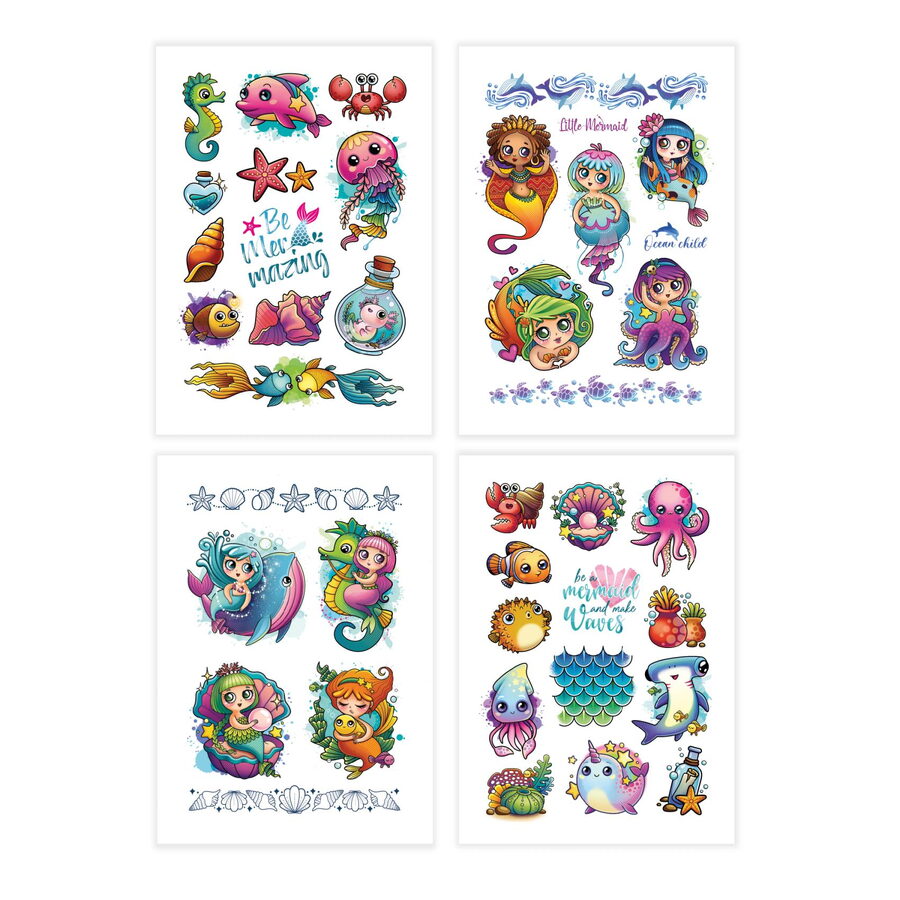 Ozdobte si své tělo krásným barevným tetováním. Vystřihněte vybraný obrázek. Přitiskněte ho na čistou a suchou pokožku Navlhčete ho vodou a po 30ti sekundách odstraňte papírek. Tetování lze odstranit mýdlem nebo olejíčkem. Vybrat si můžete z několika motivů podmořského života. Obsahuje 4 listy tetovaček.