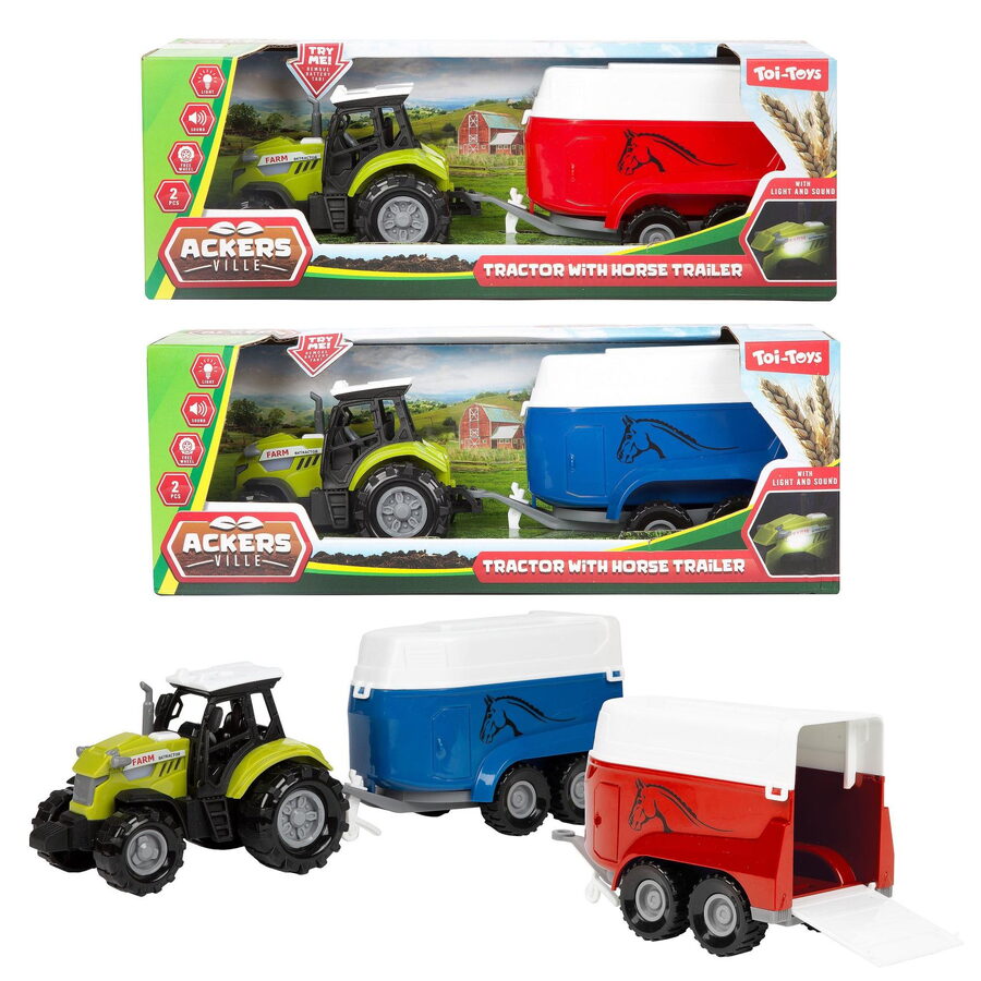 Traktor s přepravníkem na koně plast 24cm na volný chod na baterie se světlem, zvukem 2 barvy v krab