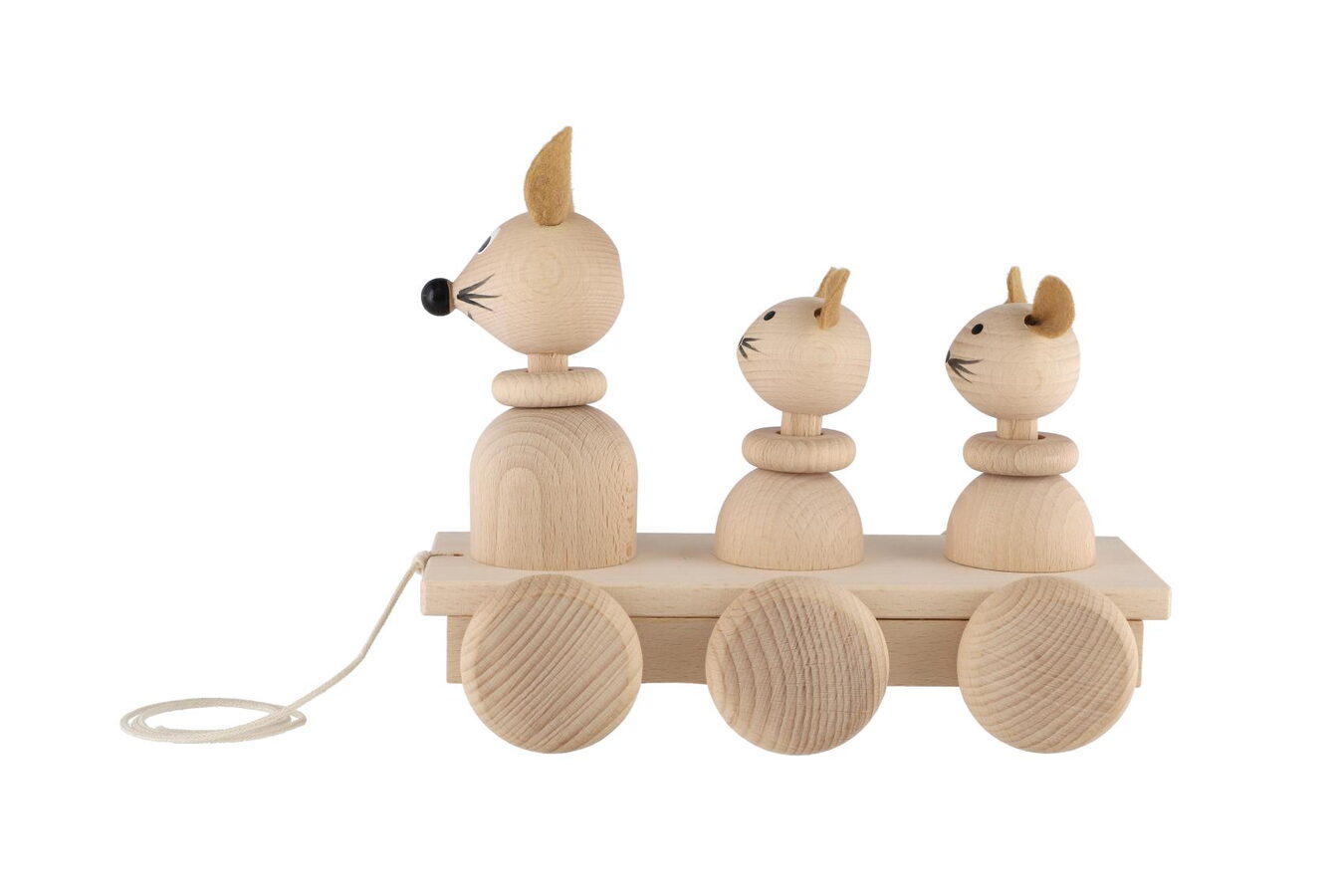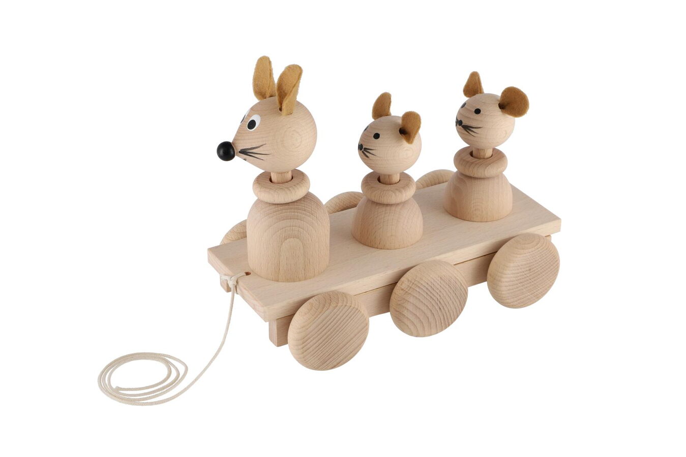 Začalo vaše děťátko již s prvními krůčky? Každé dítko má z chůze obrovskou radost a pro ještě větší zábavu mu pořiďte dřevěnou tahací hračku. Tři myšky se při jízdě roztomile hýbou.