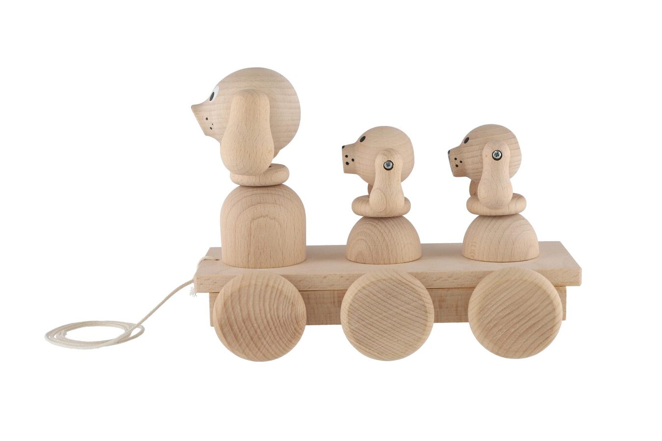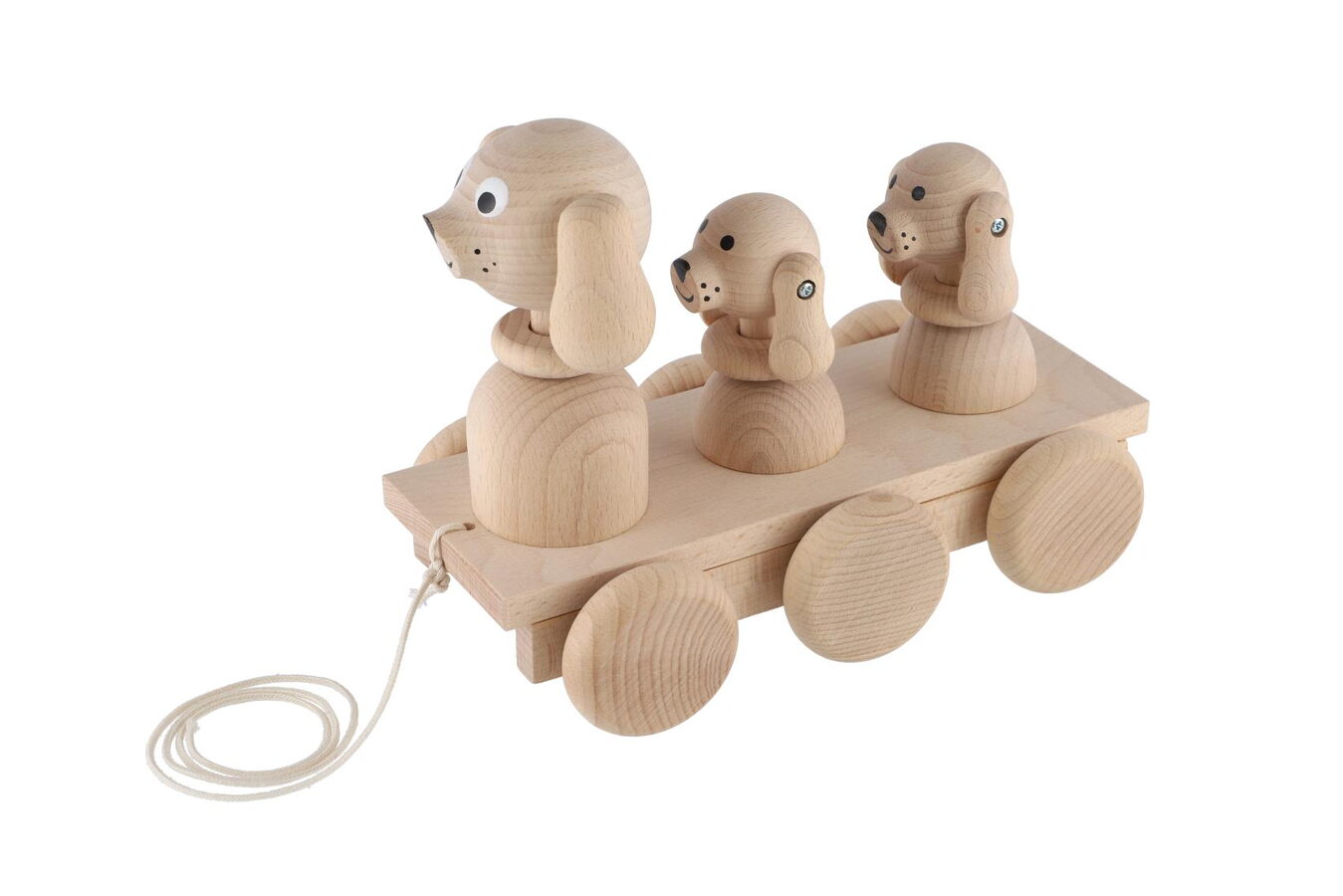 Začalo vaše děťátko již s prvními krůčky? Každé dítko má z chůze obrovskou radost a pro ještě větší zábavu mu pořiďte dřevěnou tahací hračku. Tři psi se při jízdě roztomile hýbou.