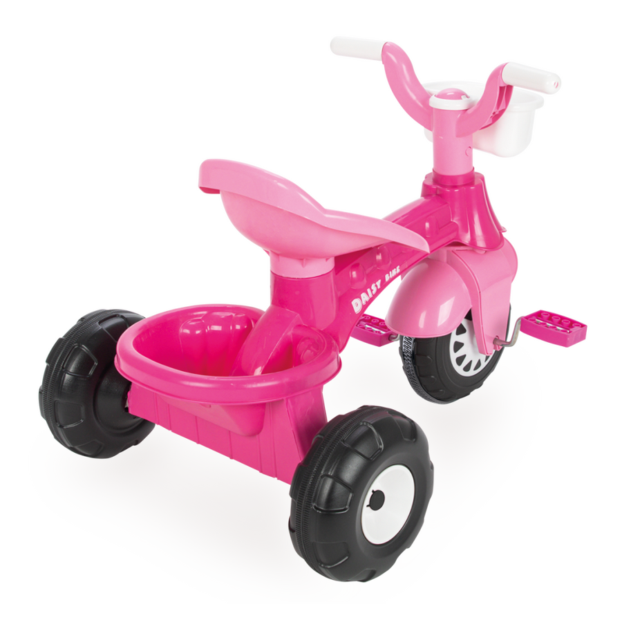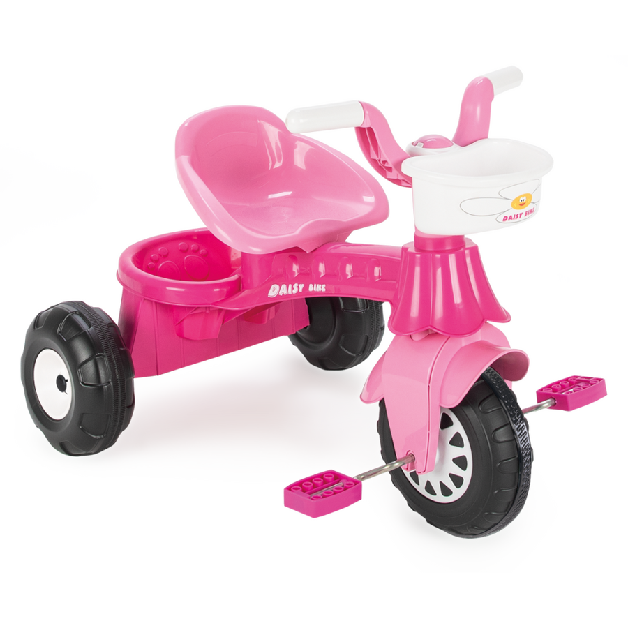 Tuto roztomilou tříkolku zdobí růžová barva s motivem kopretiny („Daisy“), která jí dodává přitažlivý dětský vzhled.Konstrukce tříkolky je lehká a zároveň pevná. Má tři robustní kola (pneumatiky jsou masivní/plastové), která zajišťují stabilní pohyb a snadné ovládání.Tříkolka nabízí praktické úložné řešení – velký košík na přední straně i další úložný prostor vzadu, kam si dítě může vložit své oblíbené hračky.Doporučený věk dítěte je od přibližně 3 let (děti od 36 měsíců). Maximální hmotnost je až 35 kg.