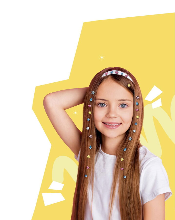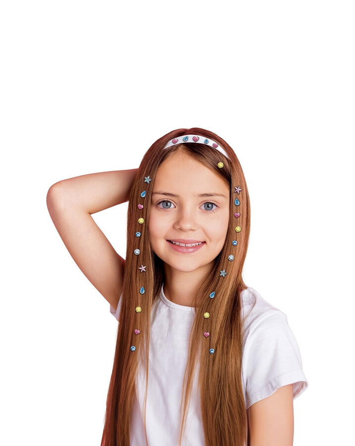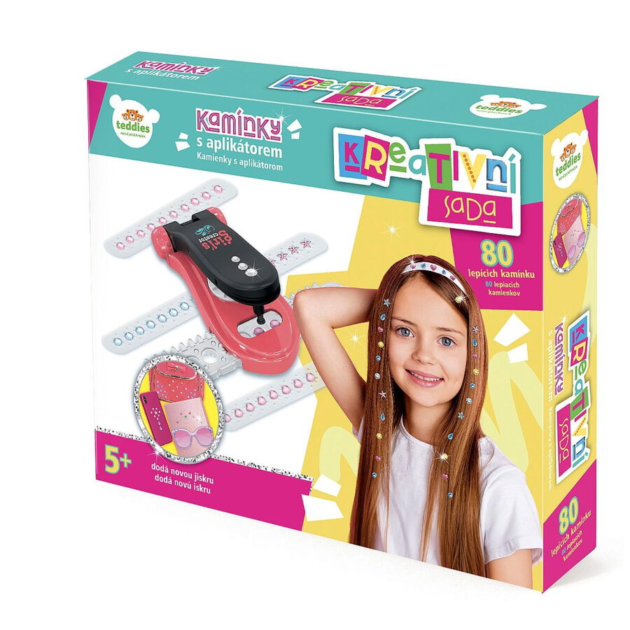 Kreativní sada obsahuje aplikátor a 80 lepicích kamínků, kterými si děti mohou ozdobit nejen vlasy, ale i deník, pouzdro na mobil, peněženku…