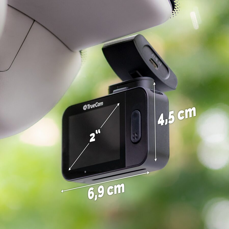 TrueCam M5 WiFi vám svou velikostí nebude nikdy bránit ve výhledu. Přesto má ale skvěle čitelný 2“ displej s širokým pozorovacím úhlem. Snadno si tak prohlédnete poslední záběr nebo upravíte nastavení. Kamera je díky své matně černé barvě velice nenápadná a kolemjdoucí si jí jen stěží všimne.