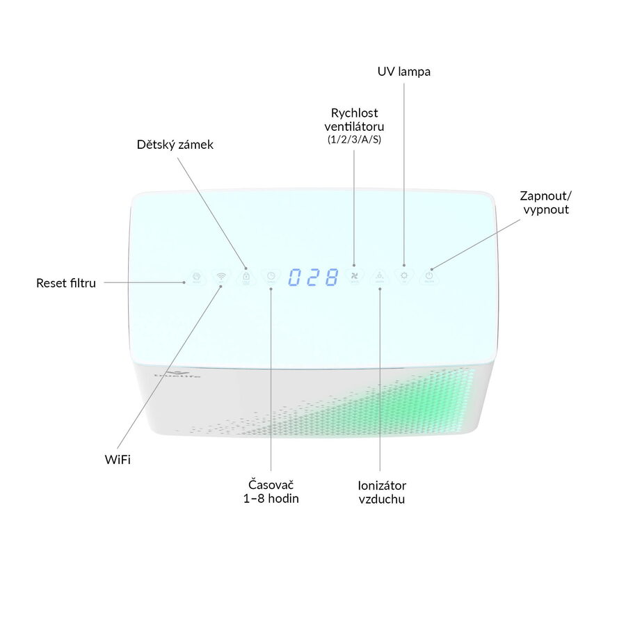 Ovládání čističky vzduchu je velmi jednoduché a intuitivní. Všechny funkce lze nastavit pomocí ikon na dotykovém displeji.