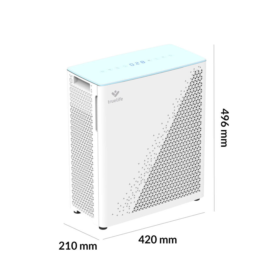 Čistička vzduchu TrueLife vyčistí až 310 m3 vzduchu za hodinu. Je vhodná do místnosti o velikosti 35-40 m2, můžete jí bez obav přenášet. Čistička celkově zlepšuje kvalitu vzduchu, ničí viry, bakterie a další nečistoty a může tak významně pomoci alergikům nebo astmatikům. Čistička je opatřena barevnými indikátory kvality vzduchu, funkcí automatické detekce nečistot a automatického čištění. Bydlíte-li na místě, kde se často práší, potěší vás přítomnost prachového senzoru. 7 násobná filtrace v podobě předfiltru, anti-bakteriálního filtru, HEPA filtru, uhlíkového filtru, katalytického filtru, UV světla a ionizace zachytí až 99,9% polétavého prachu a vyčistí 93,5 % těkavých organických látek. Zároveň zachycuje i viry a koronaviry.