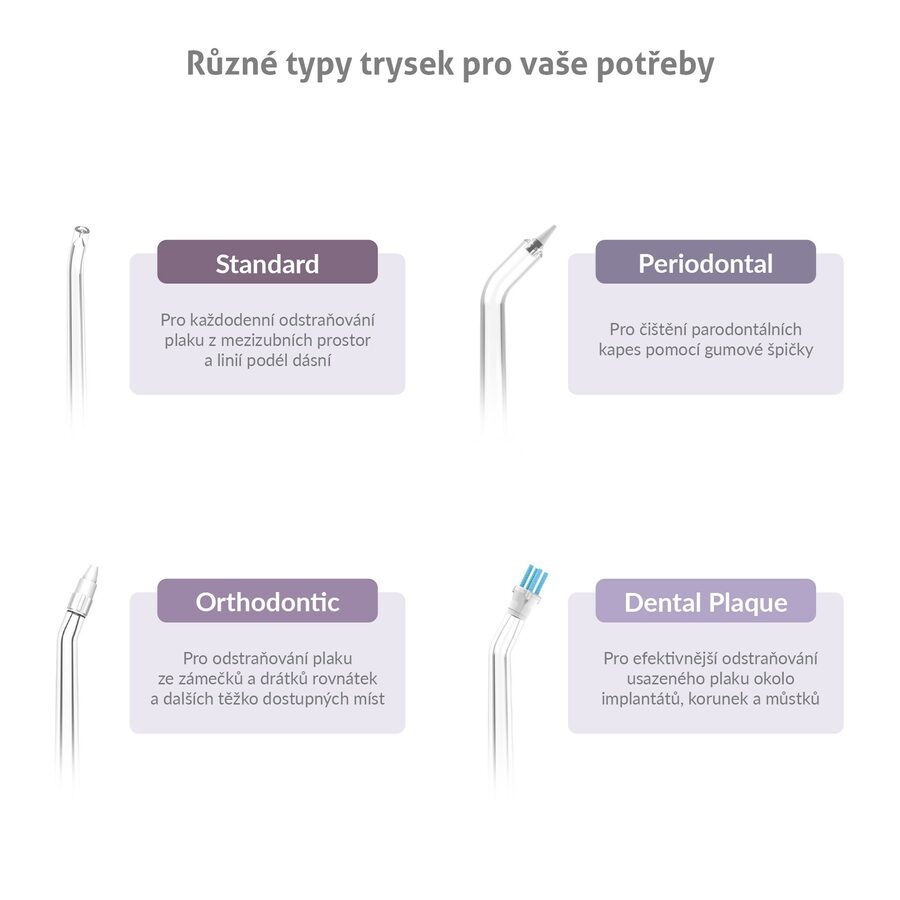 Součástí balení jsou 4 různé druhy trysek C-series, sprchu tak může využívat celá rodina. Další trysky pro různé dentální potřeby lze případně dokoupit.