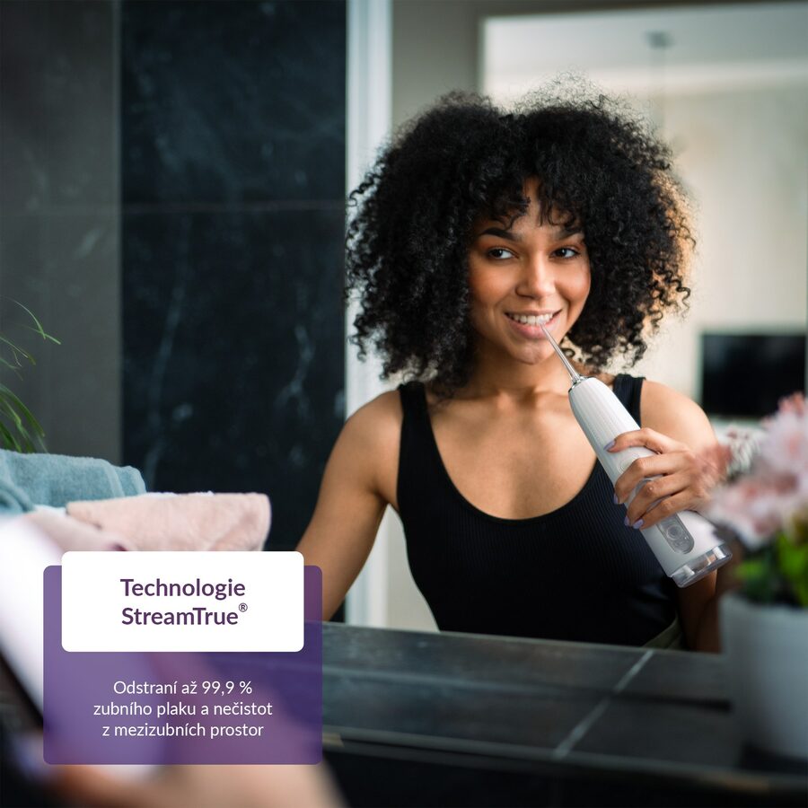 Pravidelné čištění mezizubních prostor funguje jako prevence zubních kazů a díky TrueLife AquaFloss Compact C200 je snazší i šetrnější, než používání zubních nití či mezizubních kartáčků. Pouze shora či z boku naplníte nádržku o objemu 300 ml vodou a zvolíte jeden z 5 přednastavených režimů, přičemž u režimu DIY si svým potřebám přizpůsobíte tlak. Sprcha je také vybavena technologií StreamTrue®, která vhání mikrobublinky tvořené vodou a vzduchem i do těch nejužších prostor a účinně tak odstraňuje zubní plak, bakterie a zbytky jídel.