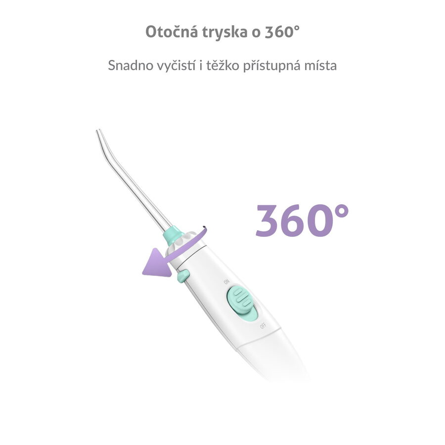 Hlavice trysky je otočná kolem dokola a snadno se tak dostane i do špatně přístupných míst vašich úst.