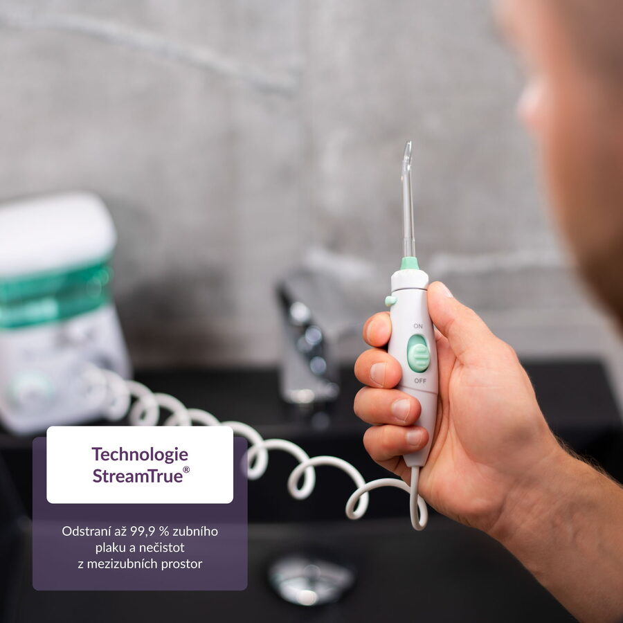 Mějte dokonalý úsměv, zdravé zuby a dásně bez práce. Ústní sprcha TrueLife AquaFloss Station vás zbaví zdlouhavého čištění mezizubních prostor. Díky technologii StreamTrue® proud kapek vody a vzduchu, který vychází z trysky ústní sprchy, dokonale pronikne i do nejmenších prostor. Výsledkem je perfektní hygiena, která odstraní až 99 % zubního plaku a bakterií. To vše bez otravných zubních nití.