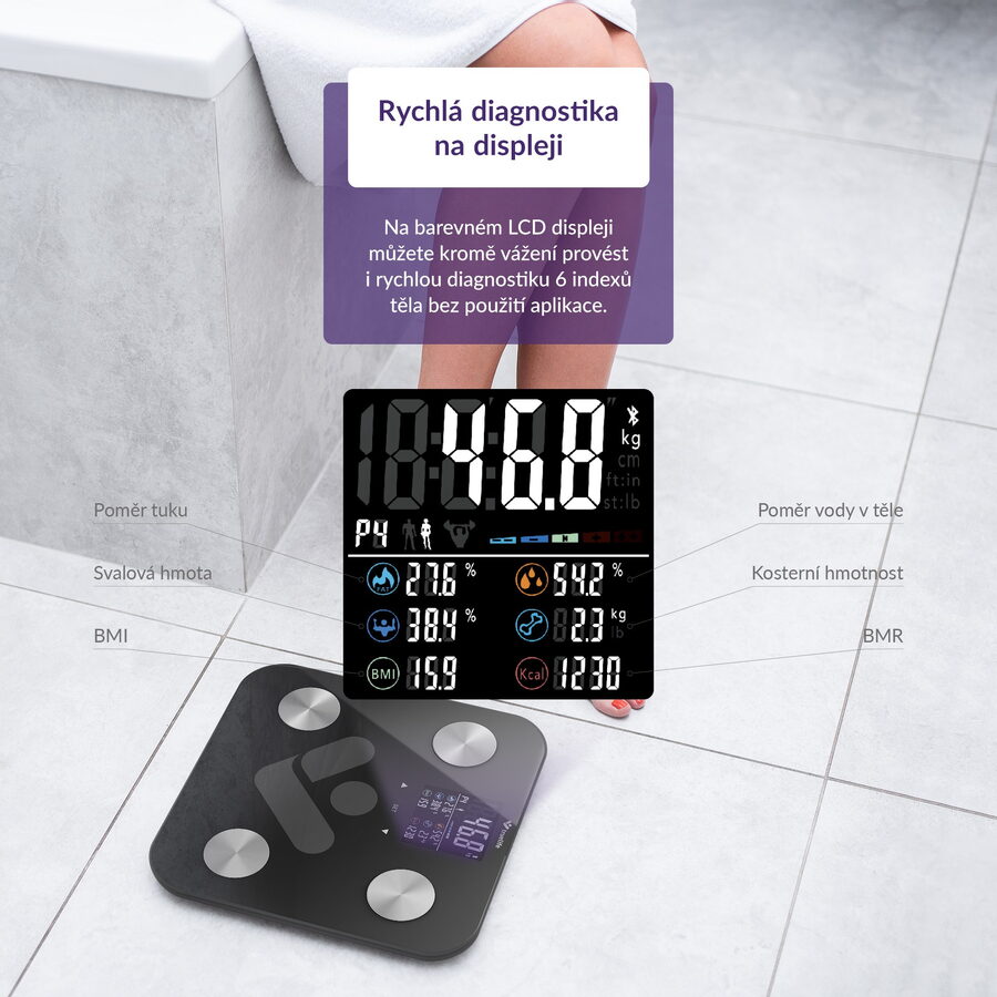 Pro rychlé zhodnocení kondice těla vystačíte s displejem váhy, kde vidíte 7 tělesných indexů i bez aplikace.