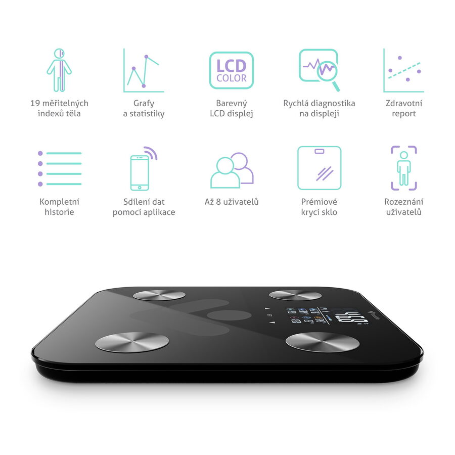 Váha umí automaticky rozpoznat až 8 uživatelů a zapamatovat si jejich údaje. Navzájem si tak mohou porovnávat výsledky a sledovat své pokroky.