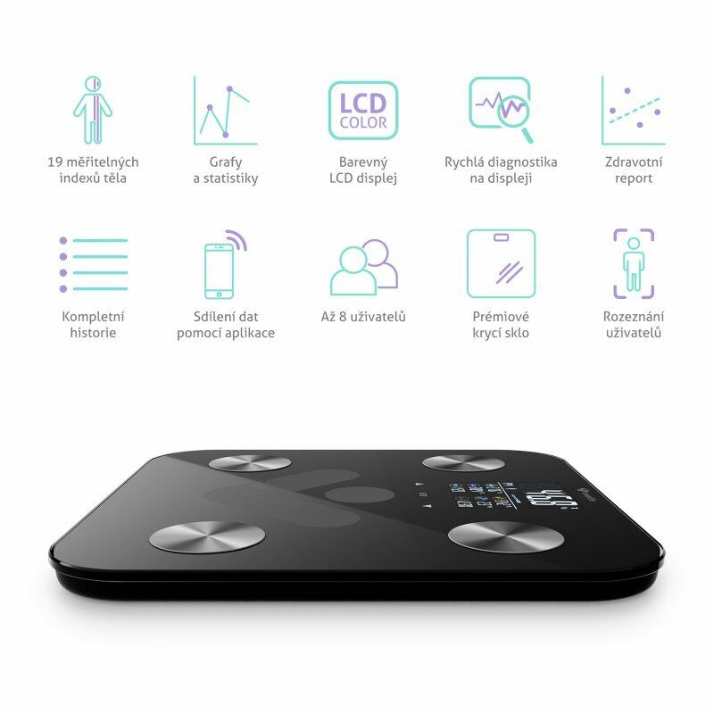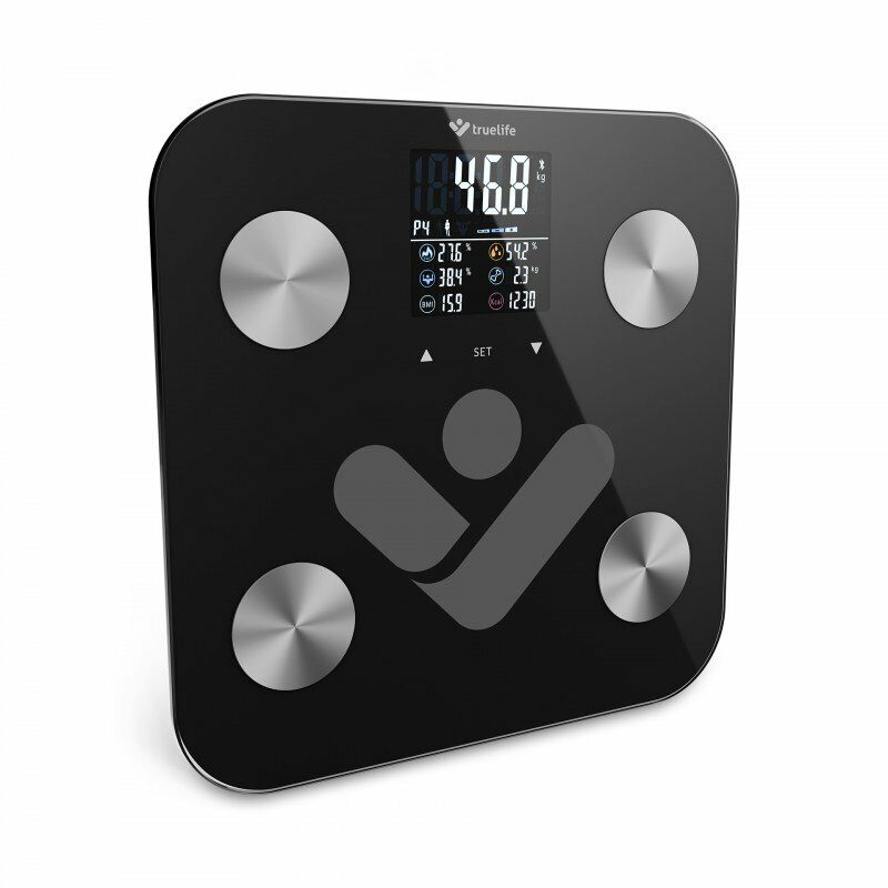 Pouhá hmotnost vám příliš neřekne. Osobní váha TrueLife FitShape S6 BT Black umí víc a dává možnost poznat tělo do detailu. Kromě přesného údaje o aktuální hmotnosti poskytuje díky bioelektrické impedanční analýze také řadu dalších důležitých informací. Přehledný barevný LCD displej se 7 indexy těla viditelně zobrazí potřebné hodnoty. Tato rychlá diagnostika prozradí o těle mnohé, ovšem ještě detailnější popis všech, tedy až 19 měřitelných tělesných indexů, získáte prostřednictvím mobilní aplikace. Váhu pouze přes Bluetooth propojíte s telefonem a hned máte k dispozici kompletní reporting o těle a statistiky. Váha je dokonce tak inteligentní, že automaticky rozezná uživatele. Její prémiové krycí sklo odolá hmotnosti až 180 kg.