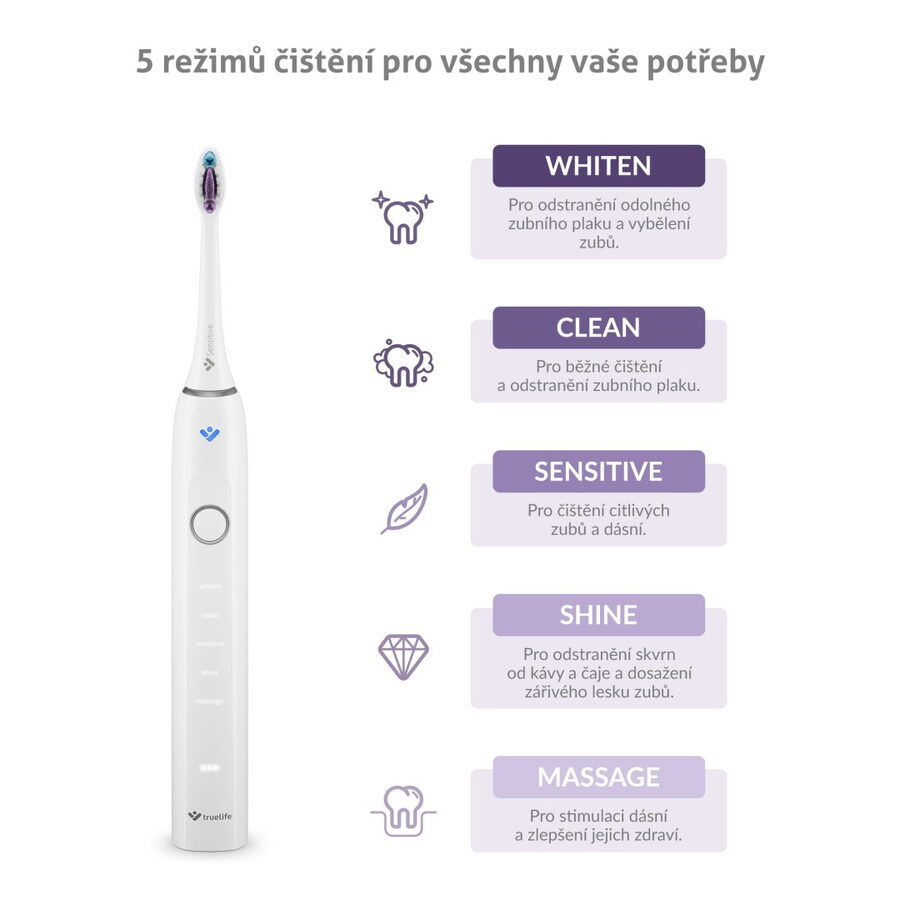 Stačí jediný kartáček pro vyřešení nejrůznějších obtíží. Balení sonického kartáčku TrueLife SonicBrush Clean70 UV zahrnuje 2 hlavice. Standard pro každodenní čištění a Sensitive s extra jemnými štětinkami pro citlivé zuby. Dokoupit lze i hlavici Whiten pro bělení zubů. Hlavice však nejsou jedinými pomocníky při péči o zuby a dásně, svou práci vykoná také 5 režimů čištění. S běžným čištěním si poradí režim Clean, o citlivé zuby a dásně se postará režim Sensitive, pro zářivý lesk a odstranění skvrn od čaje a kávy použijte režim Shine, o odstranění odolného zubního plaku a vybělení zubů se stará režim Whiten, chcete-li zlepšit zdraví dásní a stimulovat je, režim Massage je tím pravým.