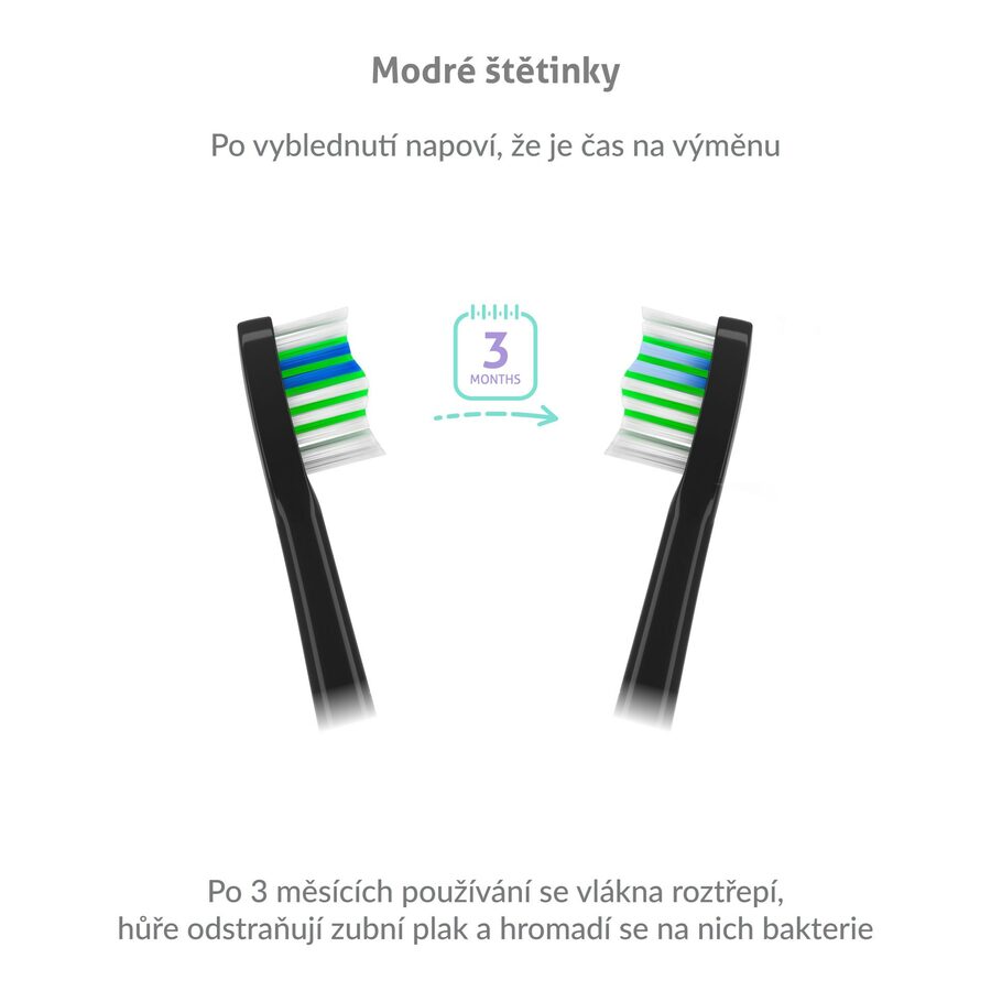 Hlavice vydrží až 3 měsíce používání, poté se začnou třepit, ztrácí účinnost a navíc se na nich hromadí bakterie. Naštěstí jsou hlavice opatřeny modrými štětinami, které po 3 měsících vyblednou a vy tak víte, že je načase hlavice vyměnit.