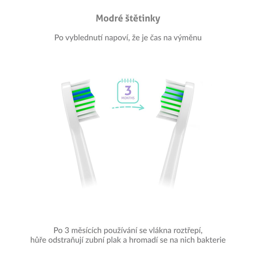 Hlavice vydrží až 3 měsíce používání, poté se začnou třepit, ztrácí účinnost a navíc se na nich hromadí bakterie. Naštěstí jsou hlavice opatřeny modrými štětinami, které po 3 měsících vyblednou a vy tak víte, že je načase hlavice vyměnit.