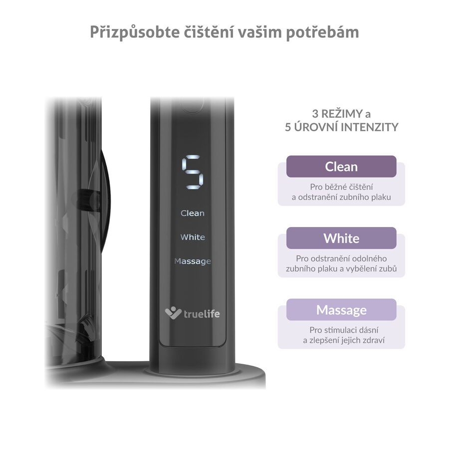 Kartáček nabízí 3 různé čistící režimy (Clean, White, Massage) a 5 úrovní intenzity čištění pro každý z nich.