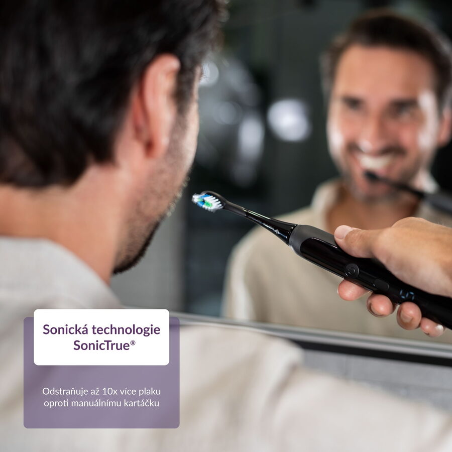 Svěřte svou dentální hygienu sonickému kartáčku s moderní sonickou technologií SonicTrue®. Tento kartáček funguje na bázi jemných vibrací, při kterých štětiny kartáčku kmitají rychlostí až 80 000 pohybů za minutu a efektivně odstraňují až 99 % zubního plaku. Dopřejte si šetrnější péči, zářivý úsměv a nedejte šanci bakteriím. Součástí tohoto kartáčku je nabíjecí základna s UV sterilizátorem, který účinně dezinfikuje hlavice kartáčku, ničí až 99,9 % bakterií a pomáhá vám udržovat kartáček v čistotě. Kartáček je kompaktních rozměrů a díky praktickému cestovnímu pouzdru a dlouhé výdrži baterie až 45 dnů si ho můžete vzít kamkoliv s sebou. Balení navíc obsahuje tři náhradní hlavice Sensitive, Standard a Whiten.