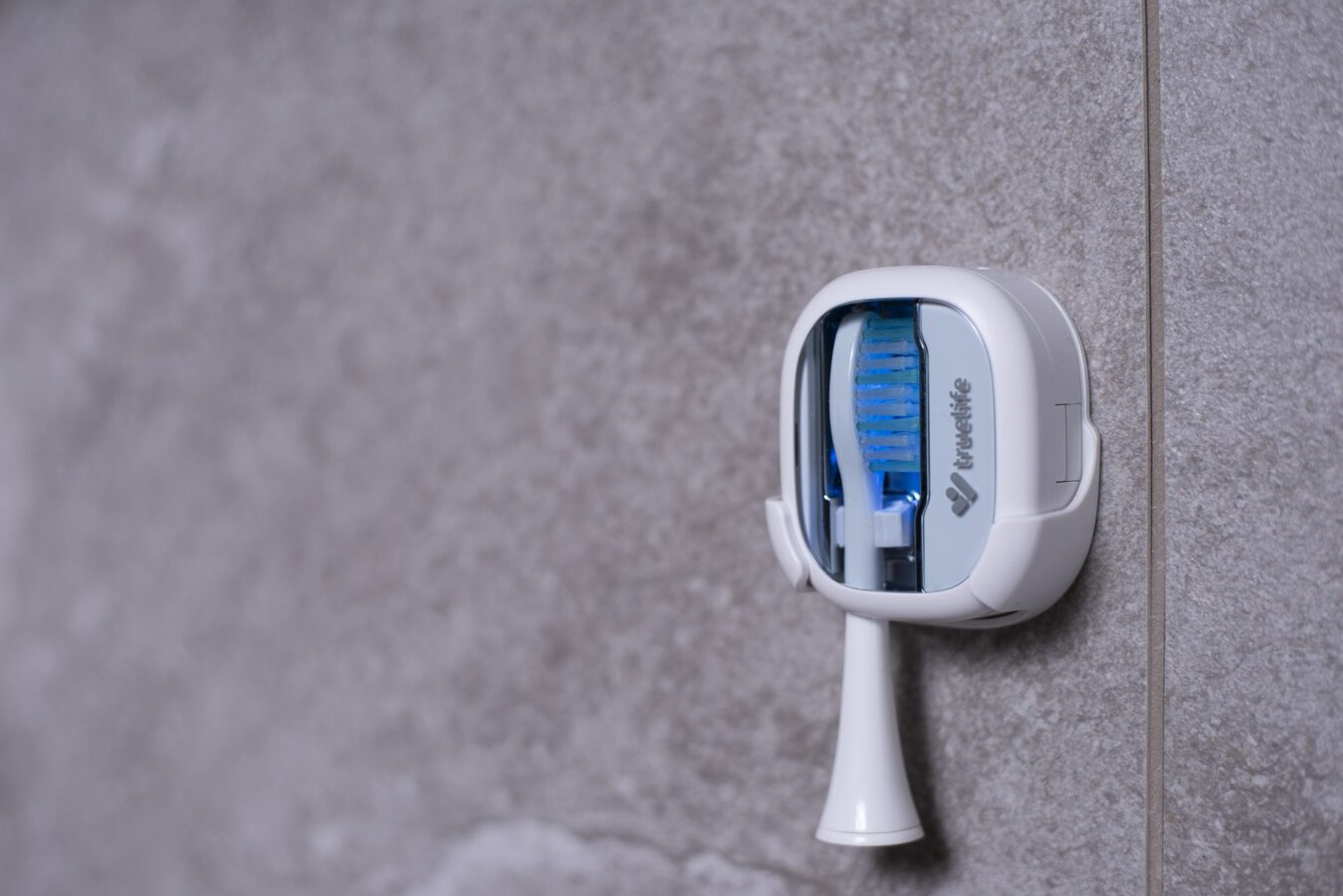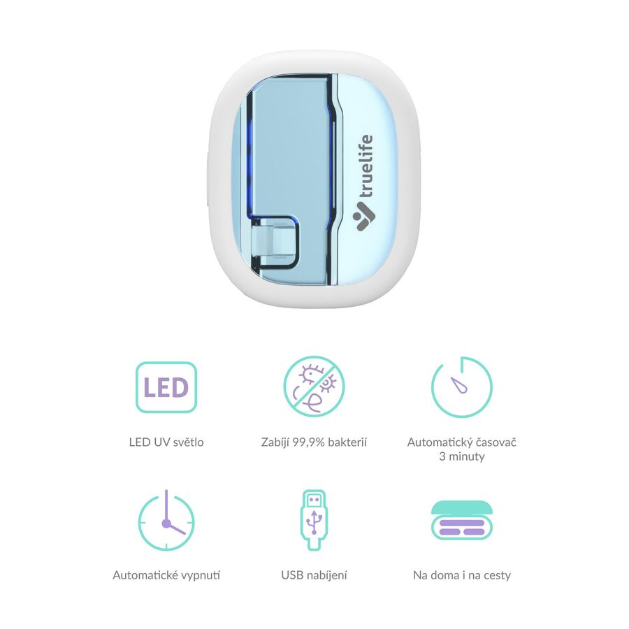 UV sterilizátor od TrueLife je malý přístroj, který efektivně ničí bakterie usazující se na hlavicích zubních kartáčků. Díky UV-C záření o vlnové délce 200-275 nm proniká k membránám bakterií, virů a plísní a zabraňuje jejich šíření. Je kompatibilní s většinou hlavic elektrických i manuálních kartáčků na trhu.
