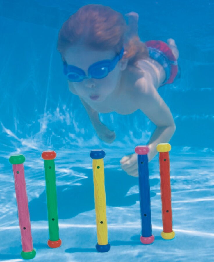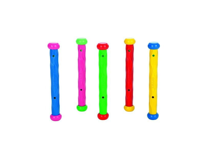 „Tyčky jsou vyrobeny z měkkého materiálu a po vhození do bazénku se „postaví“ na dno bazénku. Jsou v 5 barevných provedení a vhodné pro děti od 6 let.“