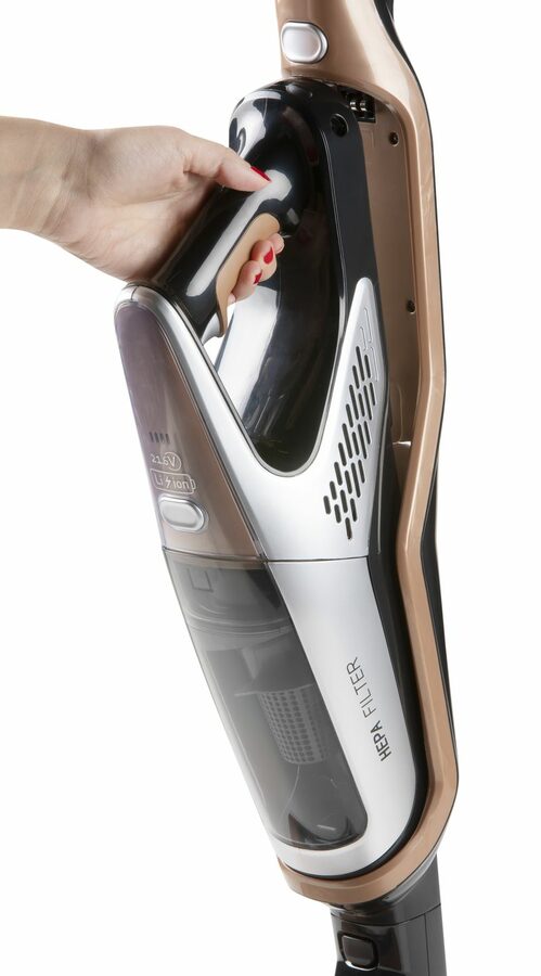 Cyklónový tyčový vysavač s HEPA filtrem a extra silnou baterií s napětím 21,6 V se stane vaším pomocníkem při každém úklidu. Baterie zaručí dostatečně dlouhou dobu aktivního vysávání. Díky rotačním kartáčům v podlahové hubici dosahuje vynikajících výsledků nejen na tvrdých podlahách, ale i na koberci.