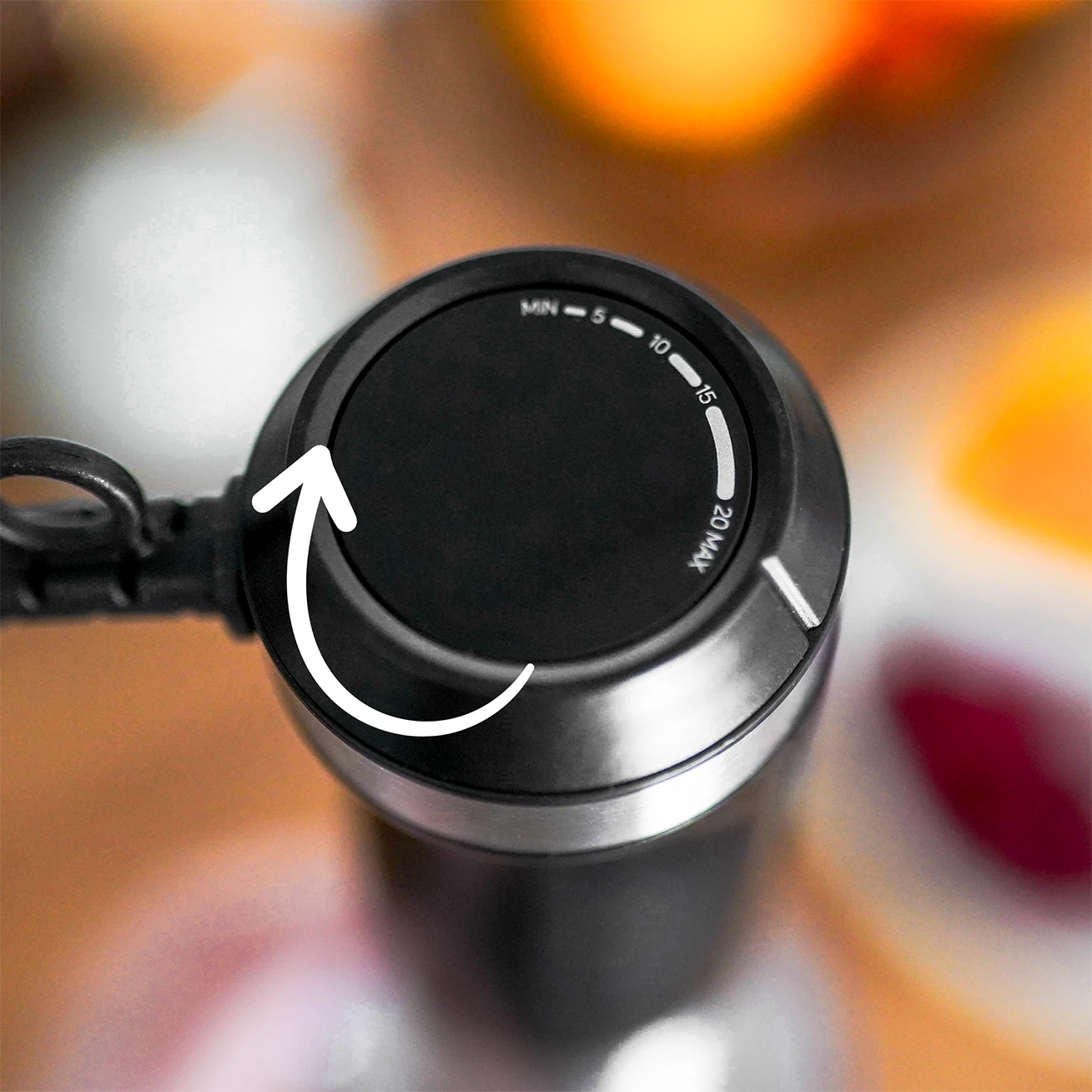 Regulace otáčekPlynulá regulace až na 20 úrovní výkonu! Různé produkty vyžadují různý výkon mixéru. Otáčením knoflíku ve směru hodinových ručiček zvyšujete výkon mixéru, opačným směrem jej snižujete. To umožňuje přesně přizpůsobit výkon mixovaným produktům. |