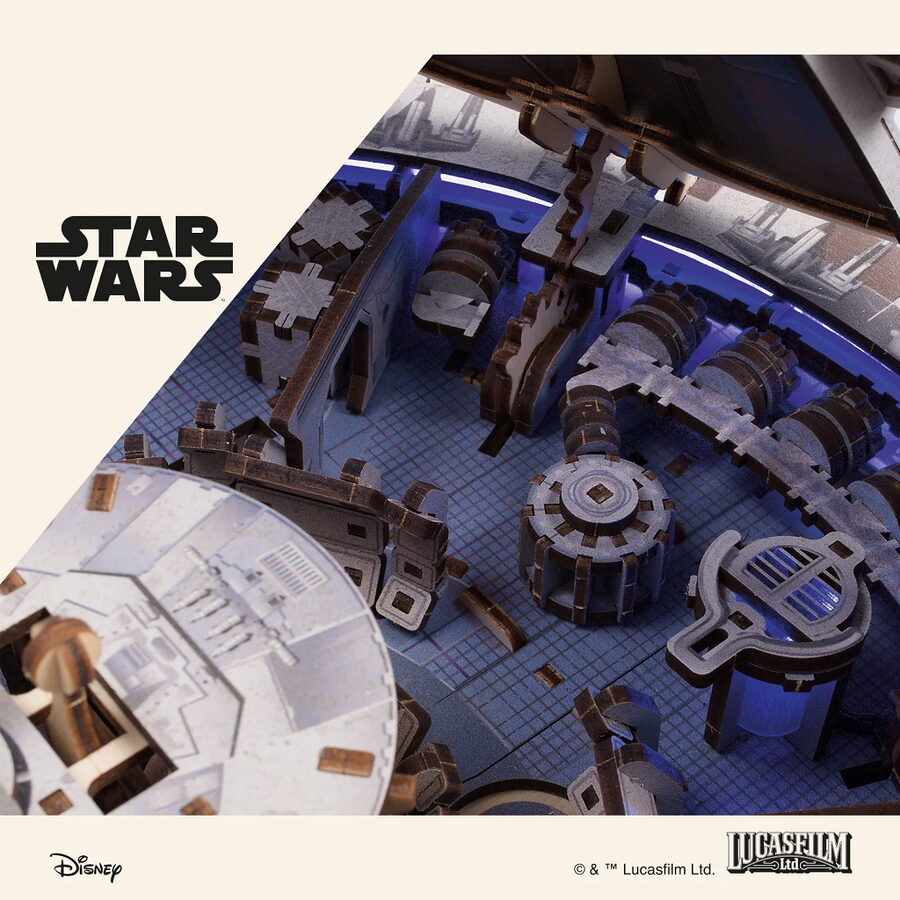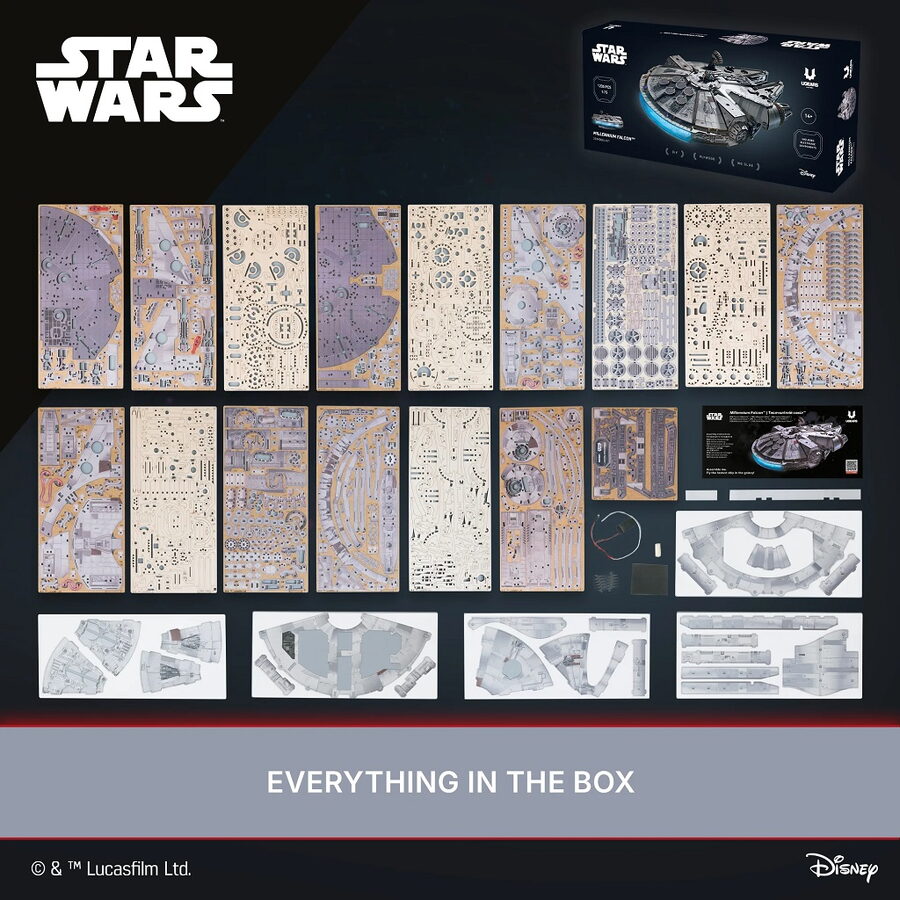 Postavte si legendární loď Millennium Falcon, ve které létal Han Solo a jeho posádka. Má modrá LED světla jako hyperpohon, otevírací střechu, nákladový prostor a rampu, pohyblivé dělostřelecké věže a anténu otočnou o 360°. Nechybí ani propracované detaily interiéru a exteriéru.Poskládejte a pilotujte nejrychlejší loď v galaxii! Proleťte Kessel Run za méně než dvanáct parseků s touto skládačkou z Ugears oficiální kolekce Star Wars.Model milované lodi Hana Sola a Chewbaccy v měřítku 1 : 75 je jedním z nejdetailnějších modelů. Millennium Falcon, klíčová stíhačka v nejzásadnějších bitvách proti Galaktickému impériu, prošla rukama řady zločinců, než byla nakonec ukradena a pilotována Rey ve filmu Síla se probouzí (2015), než ji Han a Chewie získali po tolika letech konečně zpět do svých rukou.Má detailní barevné prvky v interiéru i exteriéru, vypadá jako opravdová loď, kterou znají všichni fanoušci z filmů Star Wars. Hyperpohon simulují modrá LED světla, které jsou napájená bateriemi, ty však nejsou součástí balení.Mezi pohyblivé prvky patří dveře nákladového prostoru, rampa, podvozek, dělostřelecké věže, anténa otočná o 360° a zatahovací střecha, která se otevírá na části a umožňuje zobrazit opravdu detailní a realistický interiér lodi. Dřevovláknitá deska s vysokou hustotou a karton dodávají lodi větší odolnost a zajímavý vzhled. Postavte si kus filmové historie, postavte si impozantní 3D model lodi Millennium Falcon. Hlavní vlastnosti: Star Wars model s modrými LED světly jako hyperpohontlačítko zapíná/vypíná LED světla napájená bateriemi (nejsou součástí balení)otevírací střechaotevírací nákladový prostor s pohyblivou rampoupohyblivé dělostřelecké věžeanténa otočná o 360°detailní zpracování interiéru a exteriérubarevné dílky dodávají realistický nádechdřevovláknitá deska s vysokou hustotou pro větší odolnoststojan na vystavenímontáž bez lepidla a nástrojůobsahuje 1235 dílkůvysoká obtížnost